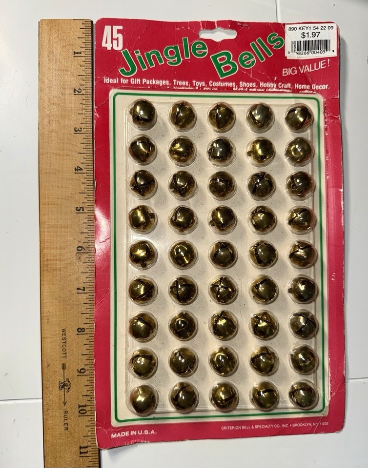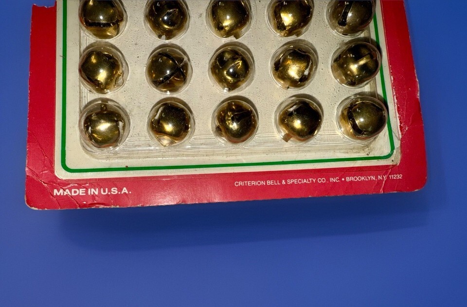Add a touch of nostalgic holiday charm to your crafts with this vintage Criterion Bell Specialty Co. package of 45 gold-tone jingle bells, still sealed in original packaging. Made in Brooklyn, New York, USA.