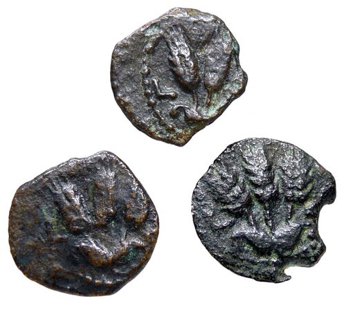 Bronze Prutah Coin, Jerusalem mint, 1.38g, 2.22g 2.56g, 16mm at widest. This is a small coin~compare a U.S. dime which is 17.9mm.
