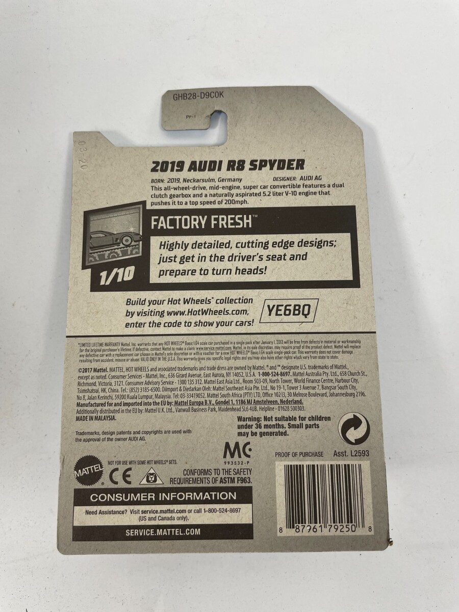 Featuring : Van / Sports Car /HotWheels 2019 Audi R8 Spyder Factory Fresh GHB28-D9C0K #H41