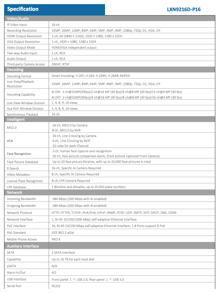 LXN9216D-P16 Pro-X IP 16CH 8K/32MP Recording Ai Built-in 16 PoE Port 2xSATA NVR