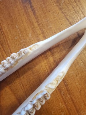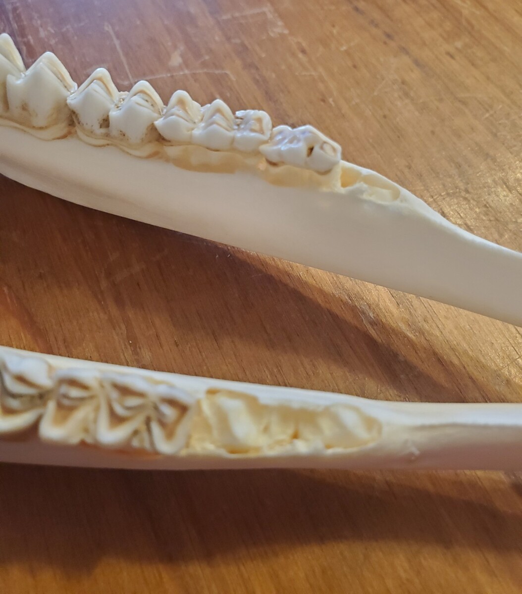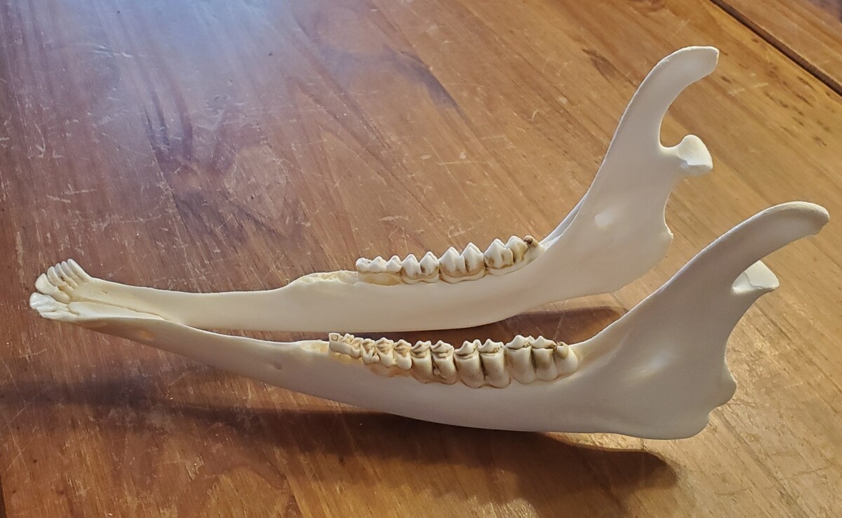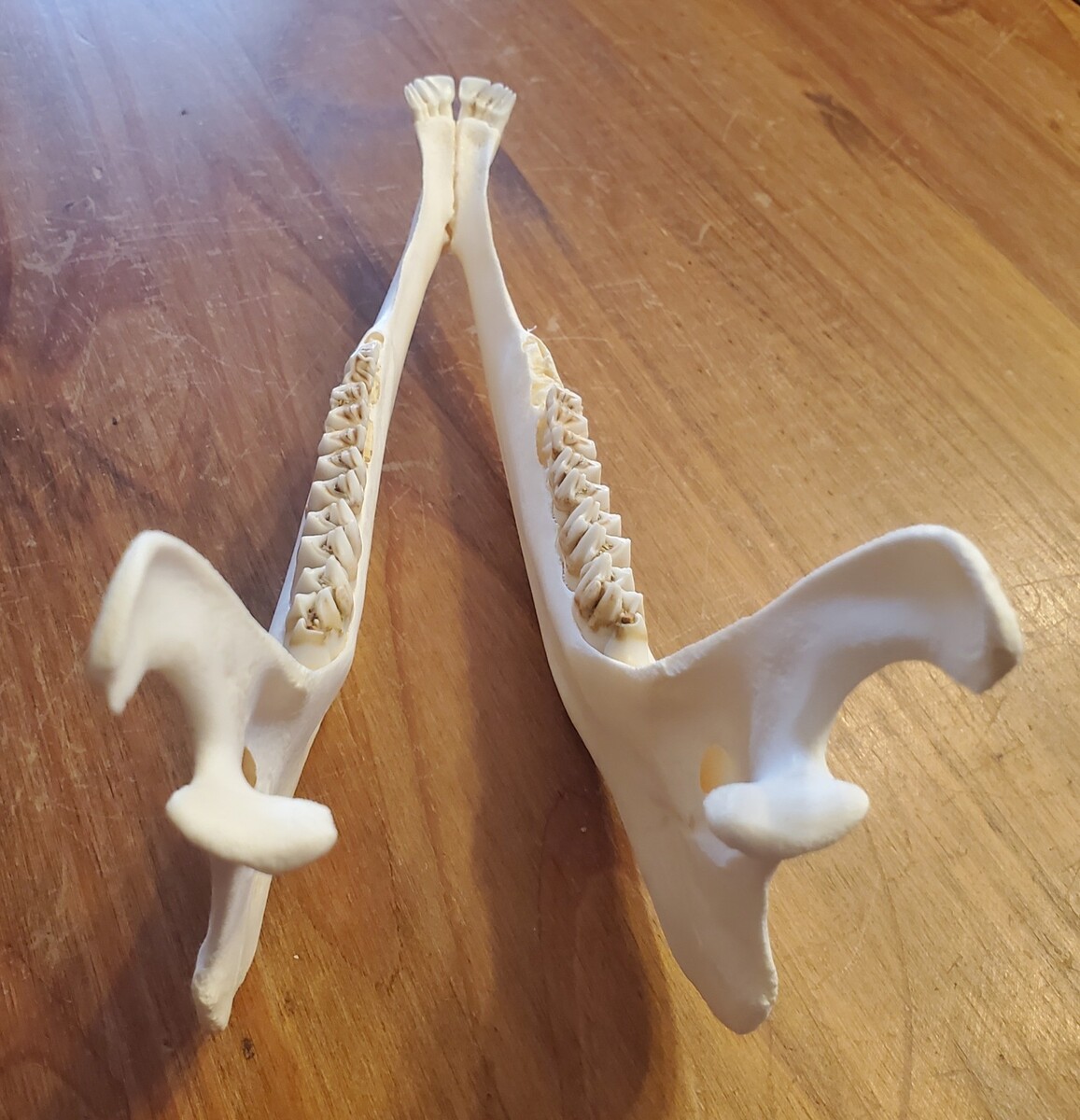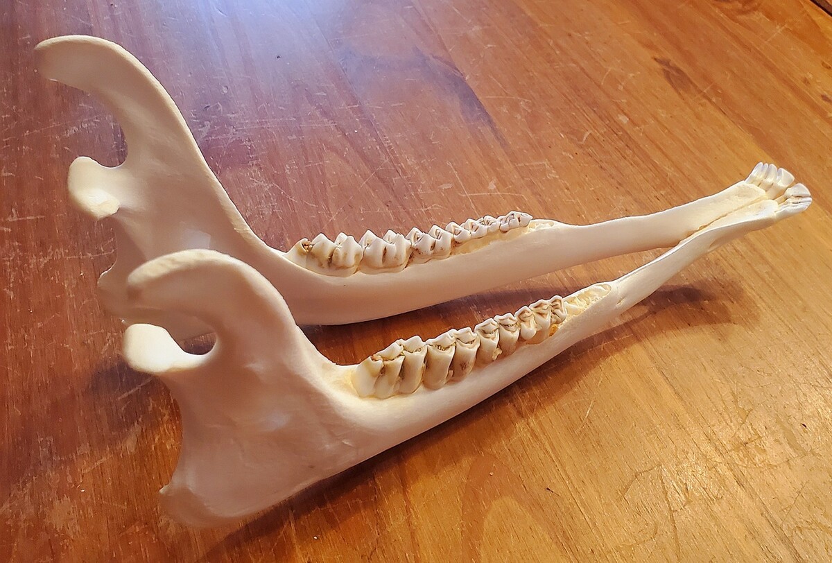 This jaw has been cleaned and whitened. I am not a taxidermist so this has not been "professionally" cleaned. Please note that there are a few juvenile teeth that are no longer there and the adult teeth can be see within the jaw. (SEE pics)