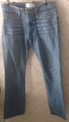 These Paper Denim Cloth stone wash jeans are in very good condition with only minimal signs of wear on the bottom of the pant leg (as seen in the photo). This does not take away from the life left in these jeans! A classic stone wash color and featuring some great details such as two front patch pockets and two slit pockets in the front a silver tone button stamped with the paper denim cloth insignia, zipper fly and no back pockets. Contrast stitching throughout. Size 27. 31.5'' inseam. 9'' leg opening. Made in the USA.