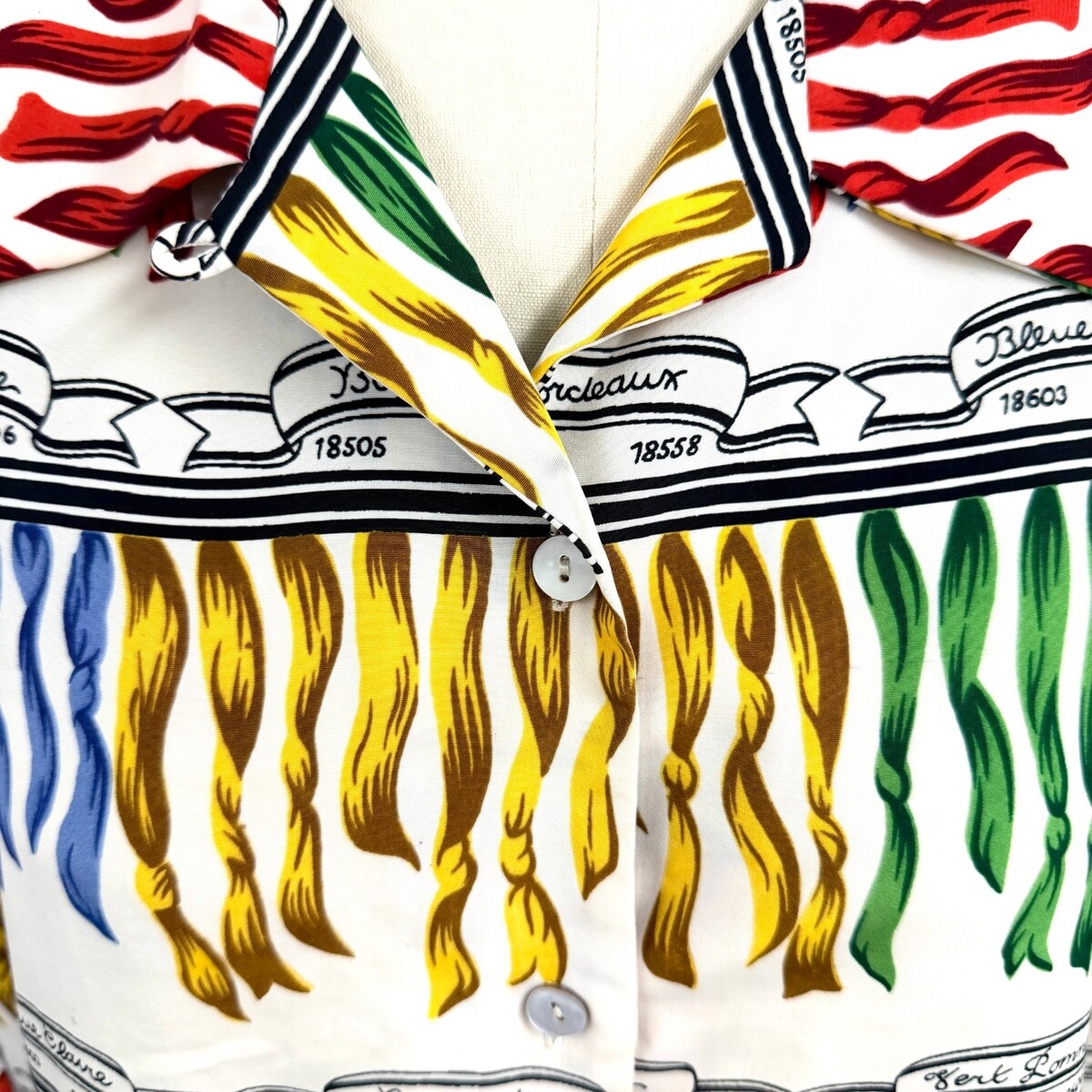 This exuberant 1980s French art-print blouse captures pure joie de vivre ? a silky, fluid top printed with painterly ribbons labeled ?Bleue Claire,? ?Rouge,? and ?Vert.? Its saturated primary palette and flowing drape recall the playful luxury of vintage Hermes or early Moschino prints.