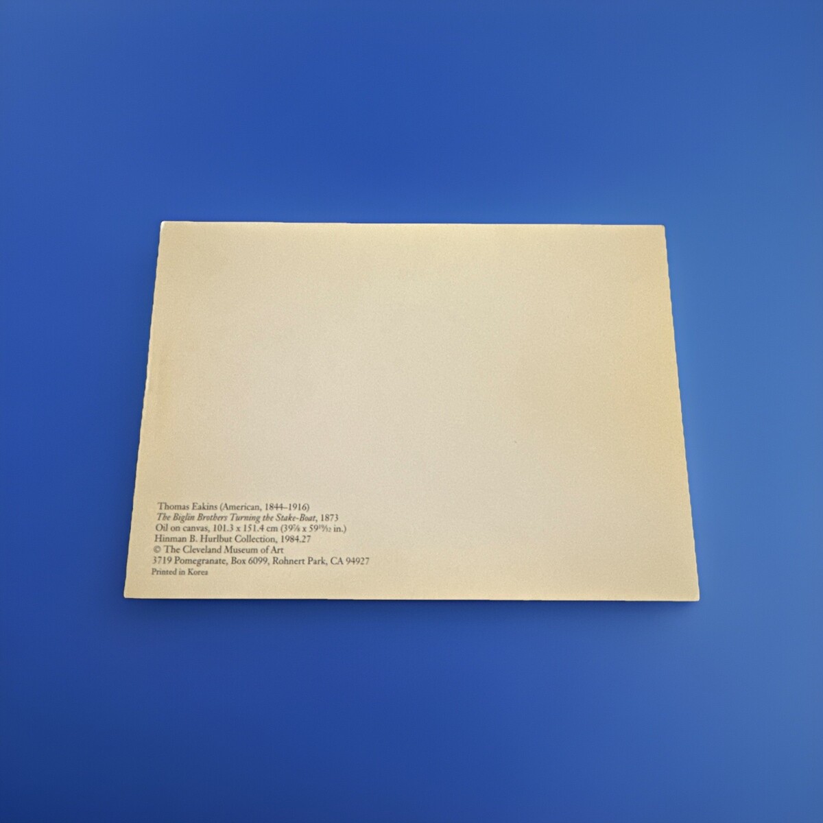 This postcard features an original photochrome print from Korea depicting The Biglin Brothers Turning The Skate-Boat, painted by Thomas Eakins. The artwork captures a scene of boating and transportation, with a sports theme, making it a unique and artistic piece for any collector. The postcard is unposted, allowing it to be used for any occasion, and adds to its potential appeal for those interested in art and history.