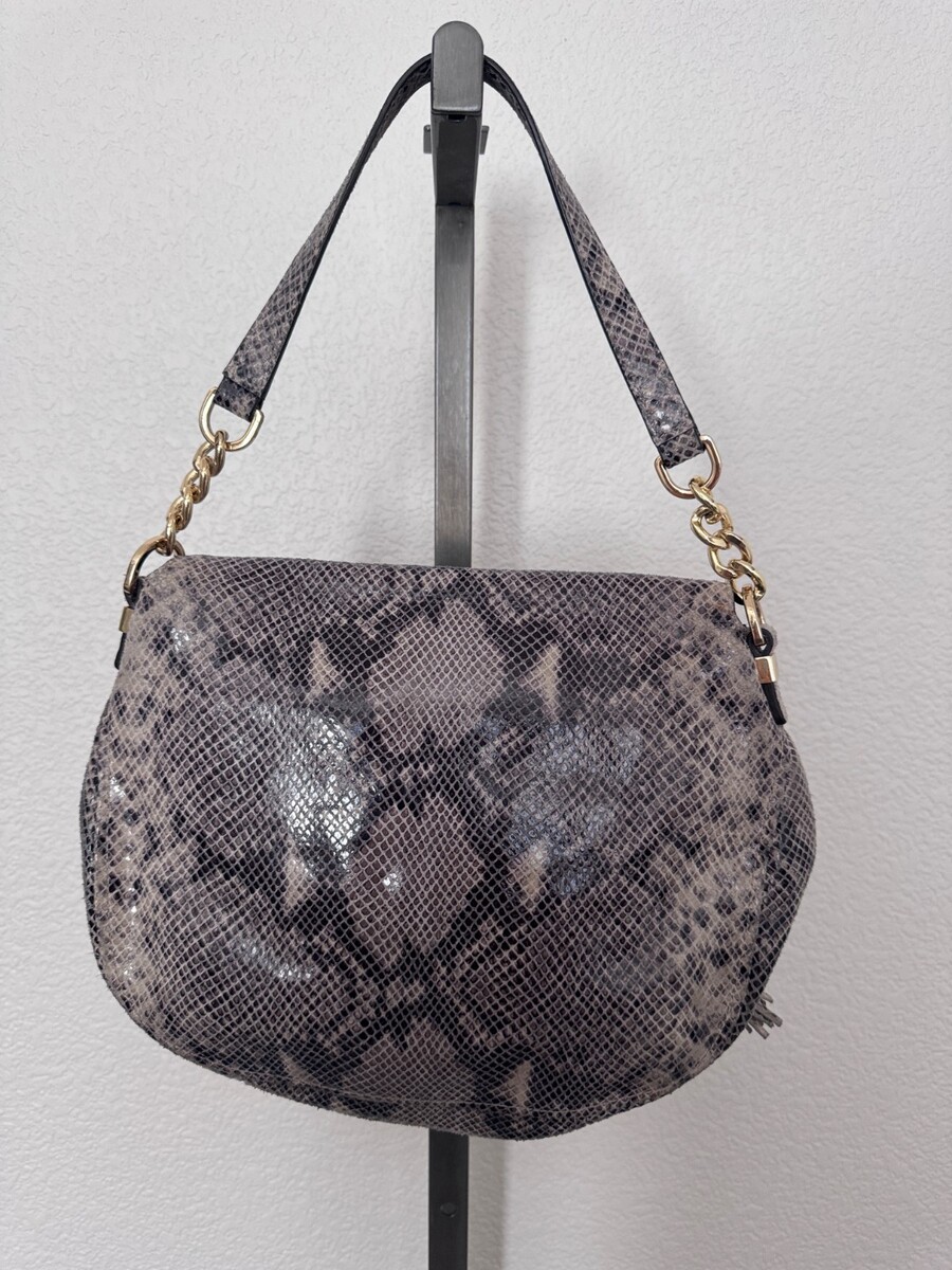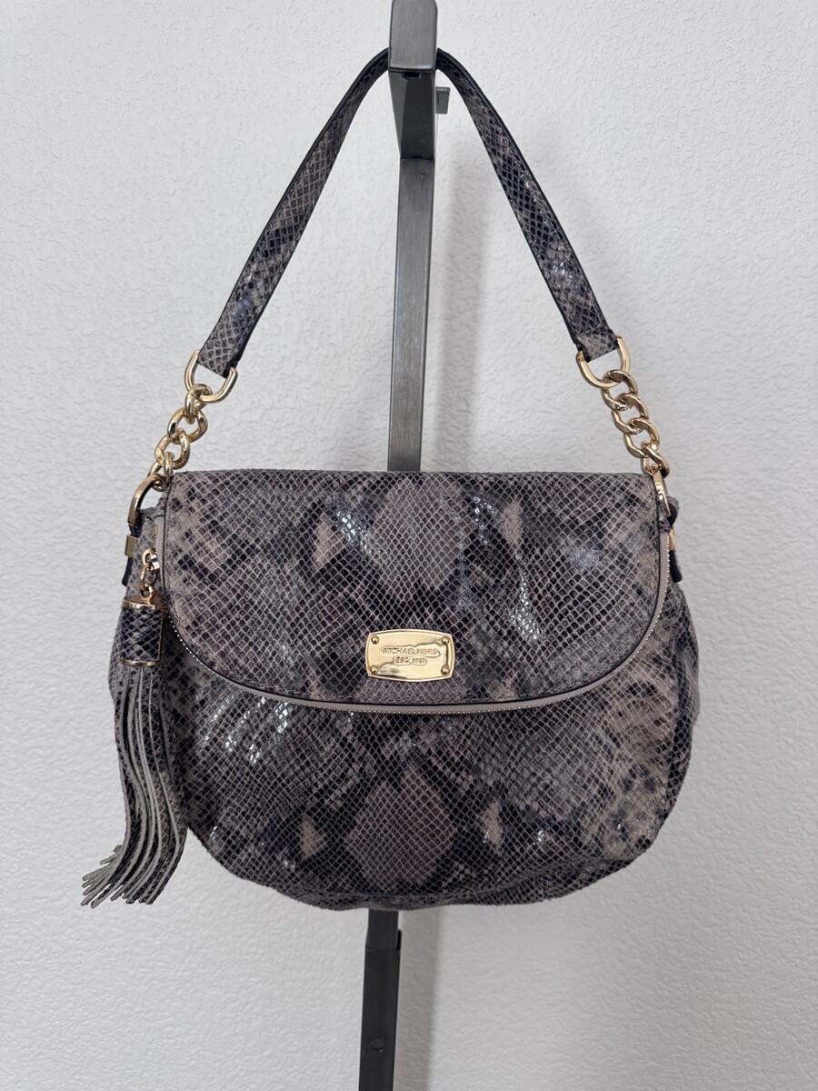 Michael Kors Snake Embossed Leather Saddle Bag with Gold Hardware Tassel Purse