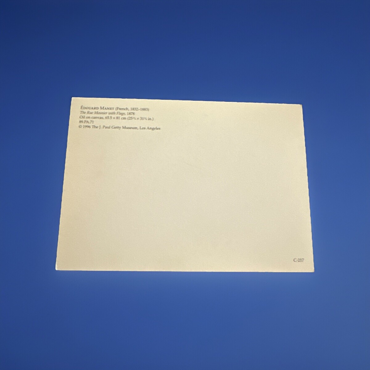 This unposted collectable postcard features "The Rue Monsnier With Flags" by Eduard Manet, a printed lithograph from the Art theme era. The original postcard showcases a photochrome style from the year 1939 to now, making it a unique addition to any art postcard collection. The details and quality of the artwork make it a valuable piece for collectors interested in non-topographical postcards, offering a glimpse into the artistic vision of the era.