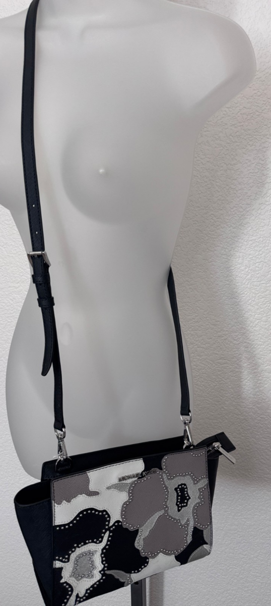 Michael Kors Selma Leather Satchel Black/Pearl Grey Messenger Purse