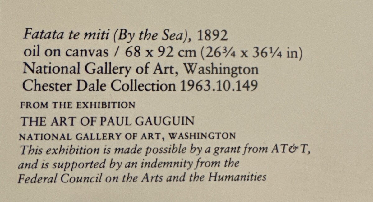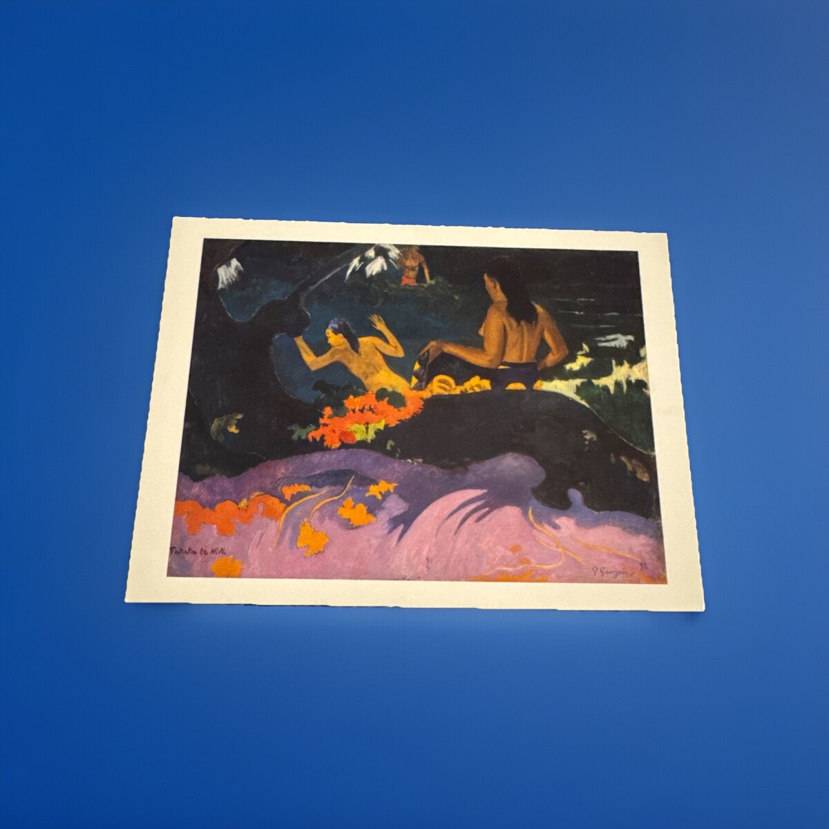 The product is a collectible postcard featuring a painting by artist Paul Gauguin titled "By The Sea" or "Fatata Te Miti." The postcard is a printed lithograph and depicts a seaside scene, making it a perfect addition to any art or postcard collection. This original piece from the United States is unposted, allowing it to be enjoyed and displayed without the constraints of postage.