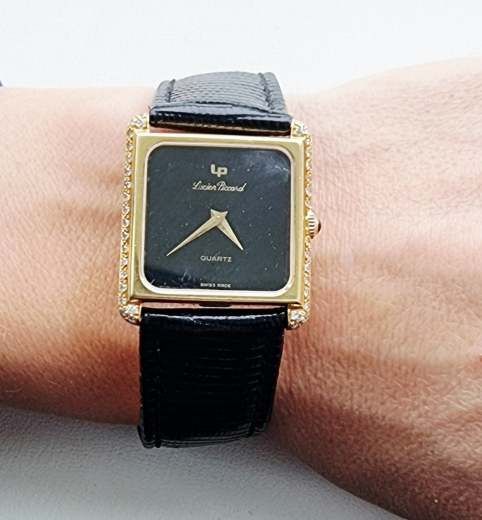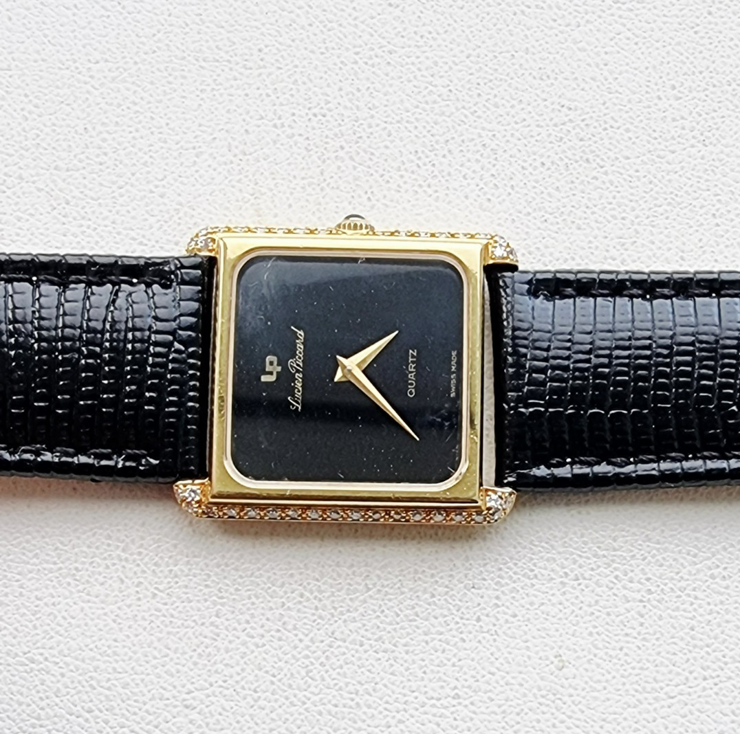 The Lucien Piccard 18K Yellow Gold Natural Diamond Woman Wristwatch is a luxurious timepiece designed for women. Featuring a vintage appeal, the watch has a gold bezel and case, with a black bracelet and dial. The bezel is adorned with a diamond, adding an elegant touch to the overall design. This analog wristwatch exudes sophistication and style, making it a stunning accessory for any outfit.
