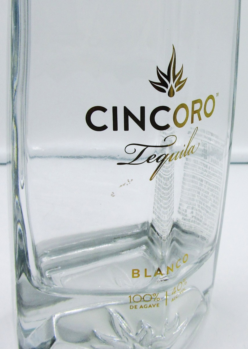 COLLECTIBLE EMPTY CLEAR GLASS LIQUOR BOTTLE CINCORO BLANCO TEQUILA MEXICO