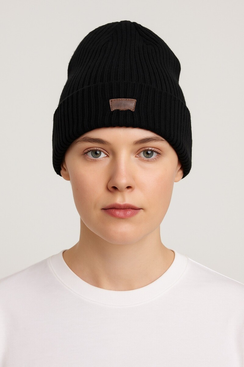 Levi’s Black Ribbed Knit Beanie Hat with Brown Faux Leather Patch – One Size