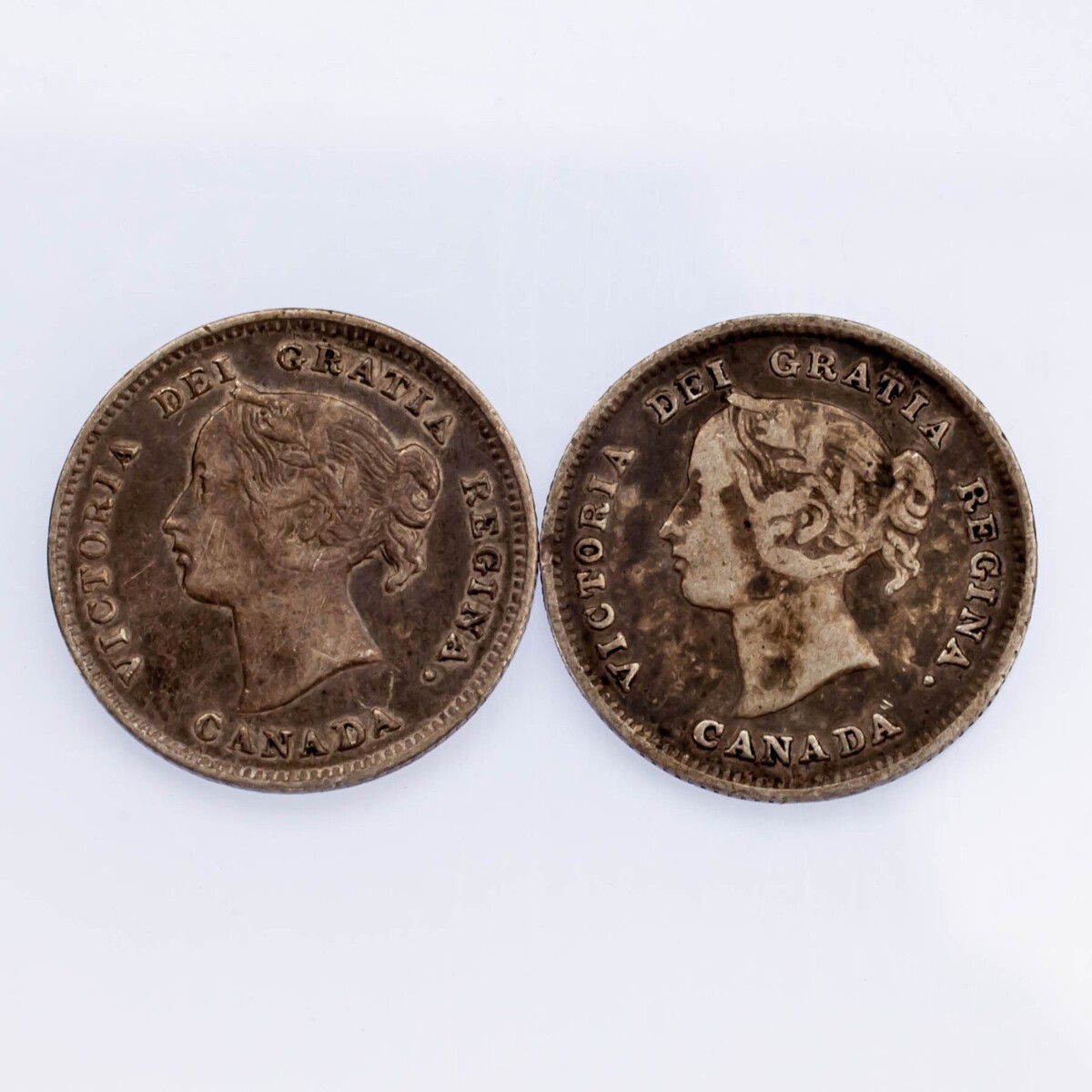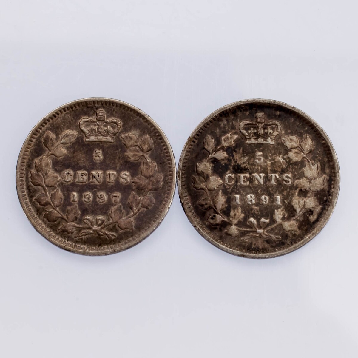 Lote de dos monedas de plata canadienses de 5 quilates, incluida la de 1891 en VF y la de 1897 en estado XF