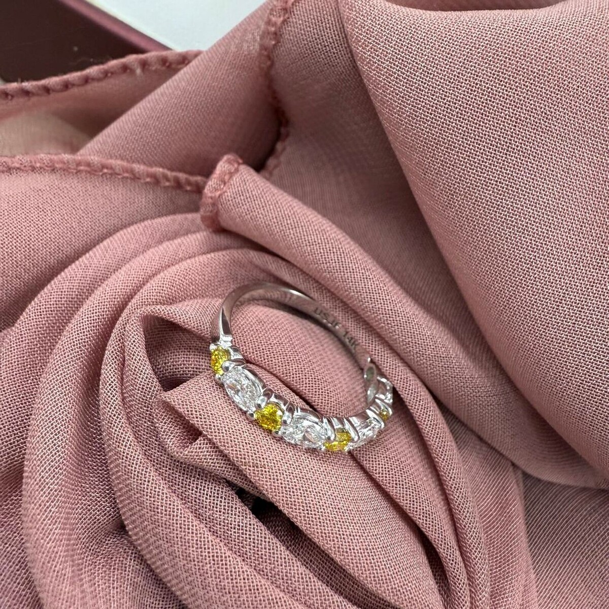 Questa fede nuziale con 9 diamanti in pietra e una scintillante espressione di amore e impegno!! Realizzato in splendido oro bianco 14k, presenta diamanti fantasia taglio brillante rotondo giallo vivido e diamanti incolori taglio brillante marquise coltivati ??in laboratorio, ciascuno tenuto saldamente in un'incastonatura a punta. Il peso in carati totale e di 1,00 carati.