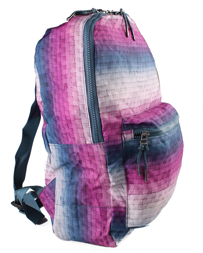 Classic backpack with a colorful basket weave print. Two way zipper opens up to the main compartment with a small compartment with a carabineer. Front zippered pouch with a logo tab offers more storage. Nylon adjustable straps at the back. Entire bag packs into inner pocket for a portable storage solution.