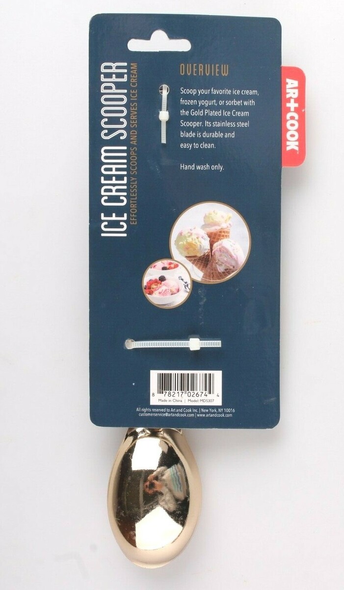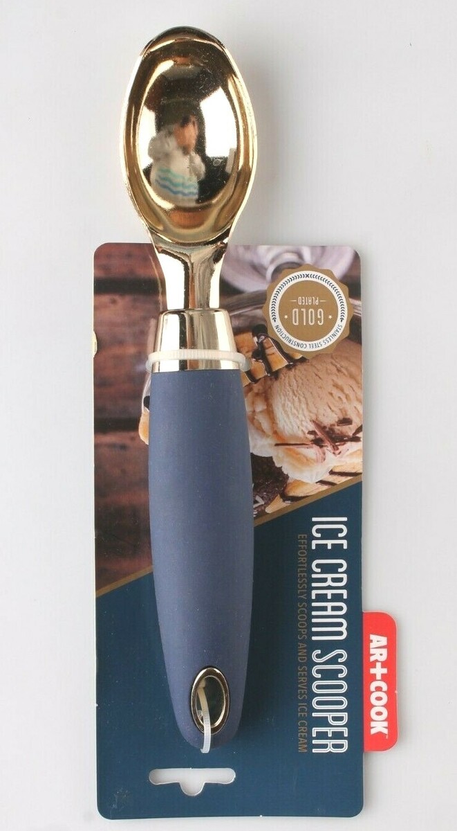 This is for a brand new on card Art Cook Silicone Stainless Steel Ice Cream Scoop Blue and Gold. Scoop your favorite ice cream, frozen yogurt, or sorbet with the gold plated ice cream scooper. Its stainless steel blade is durable and easy to clean.