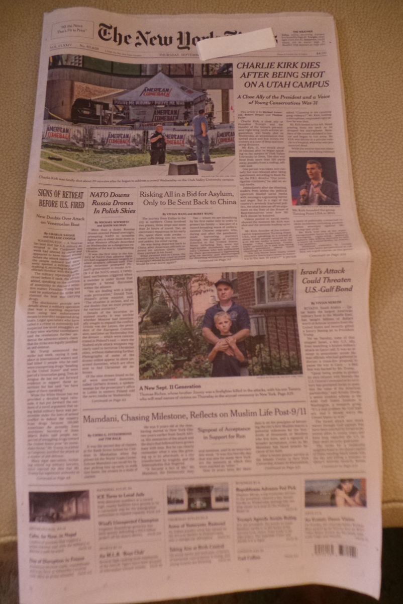 New York Times newspaper Charlie Kirk Shot & Dies Sept 23 2025F