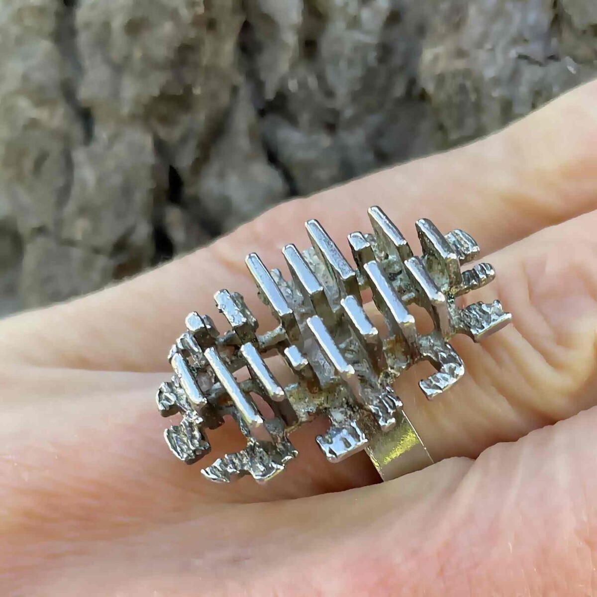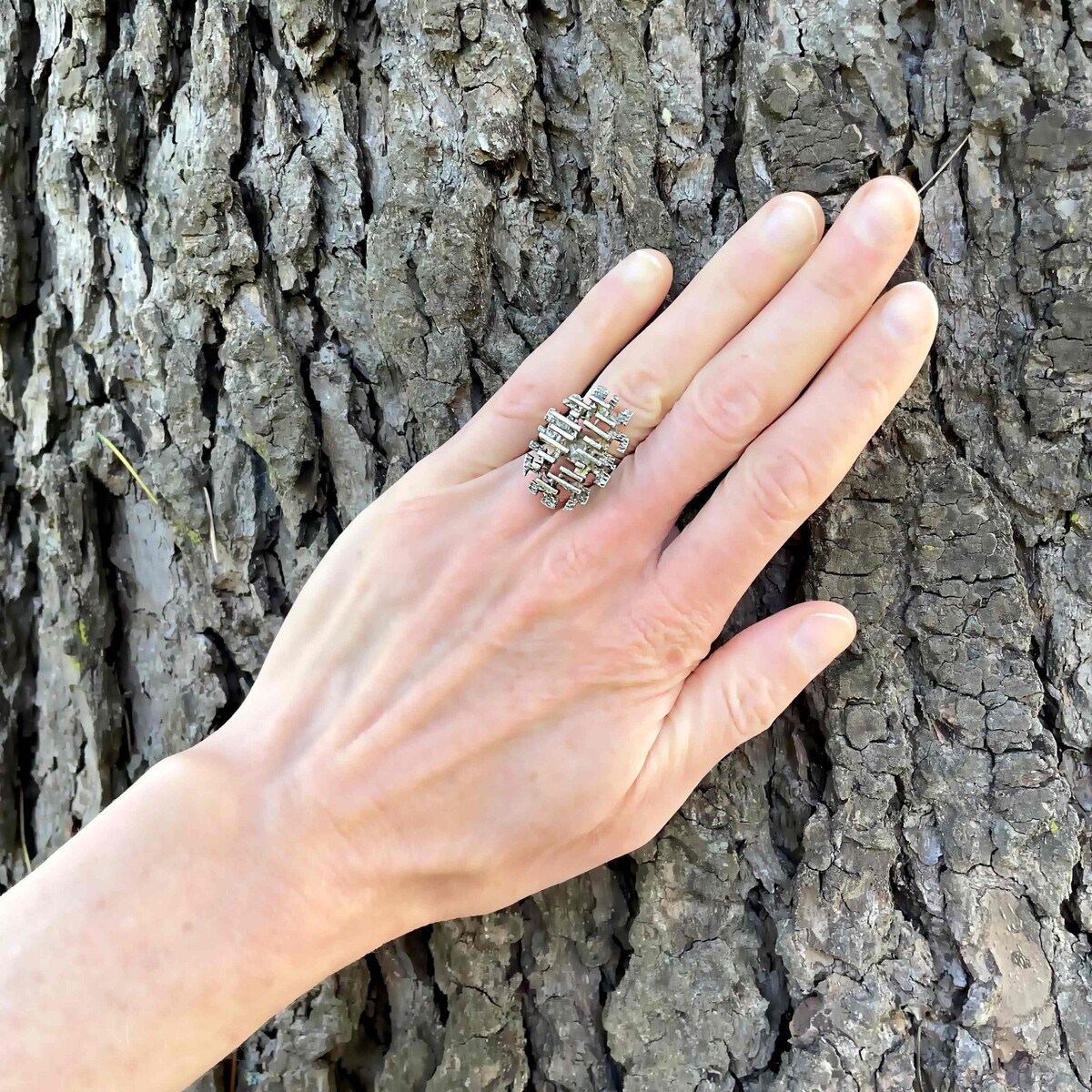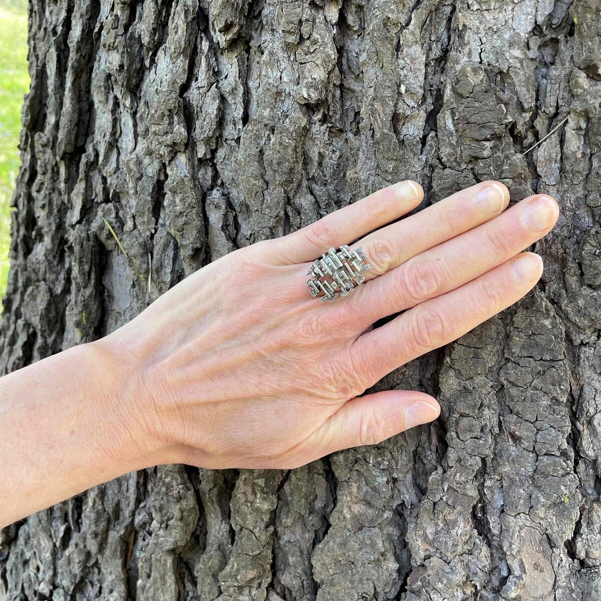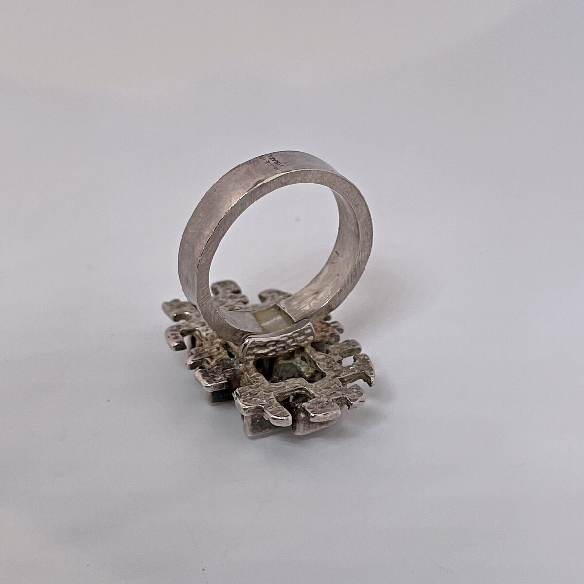 The design of this ring is eye catching and iconic of the era with is abstract almost architectural sculptural design.