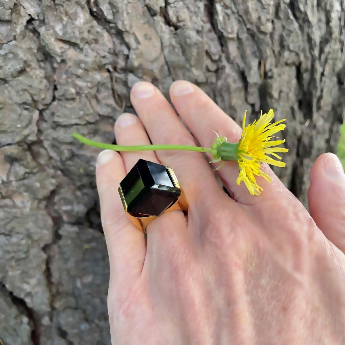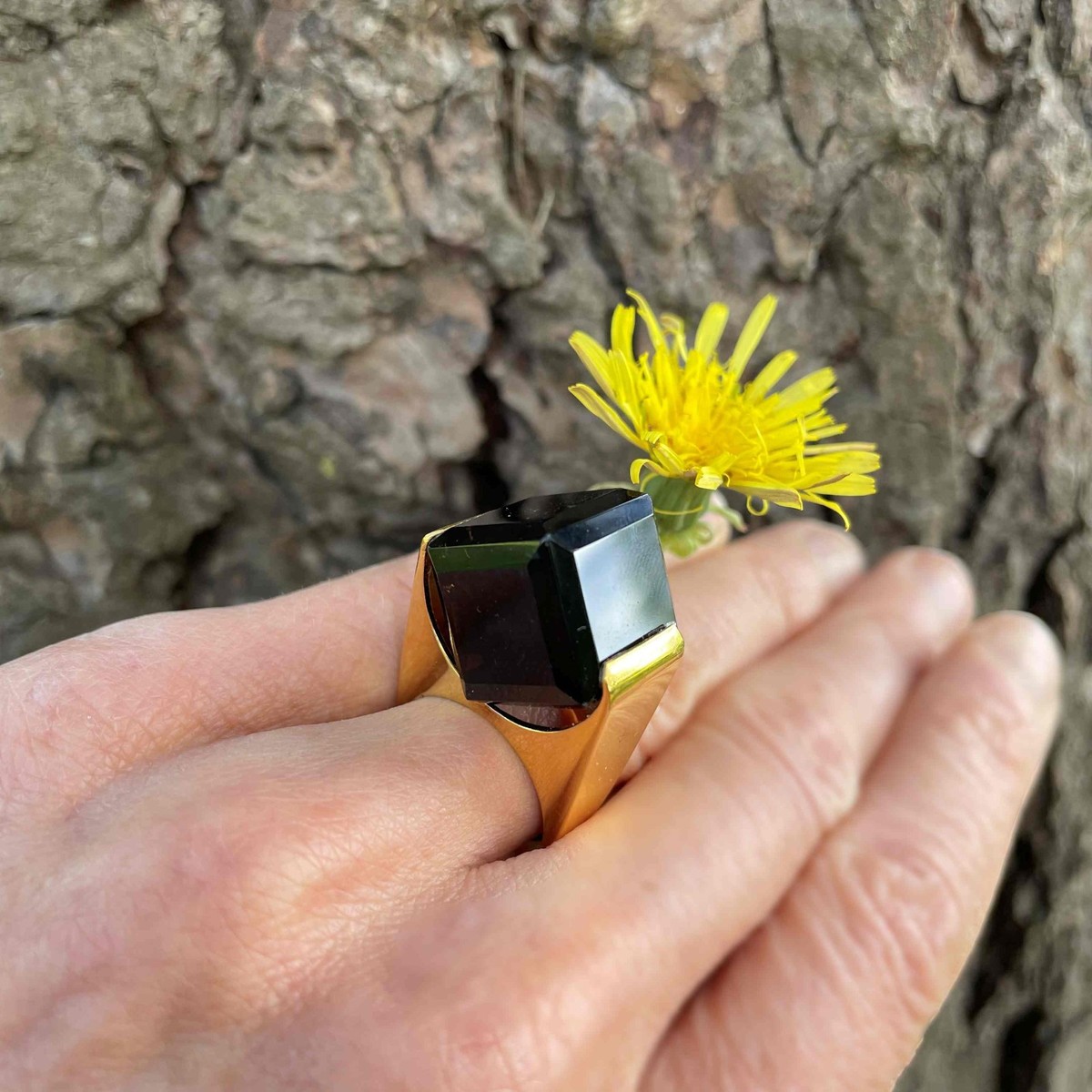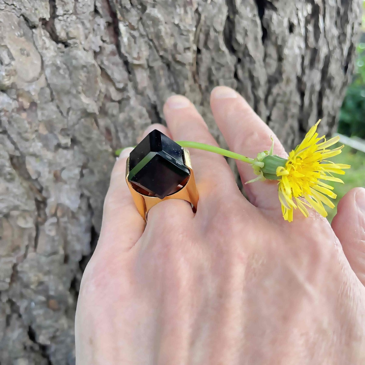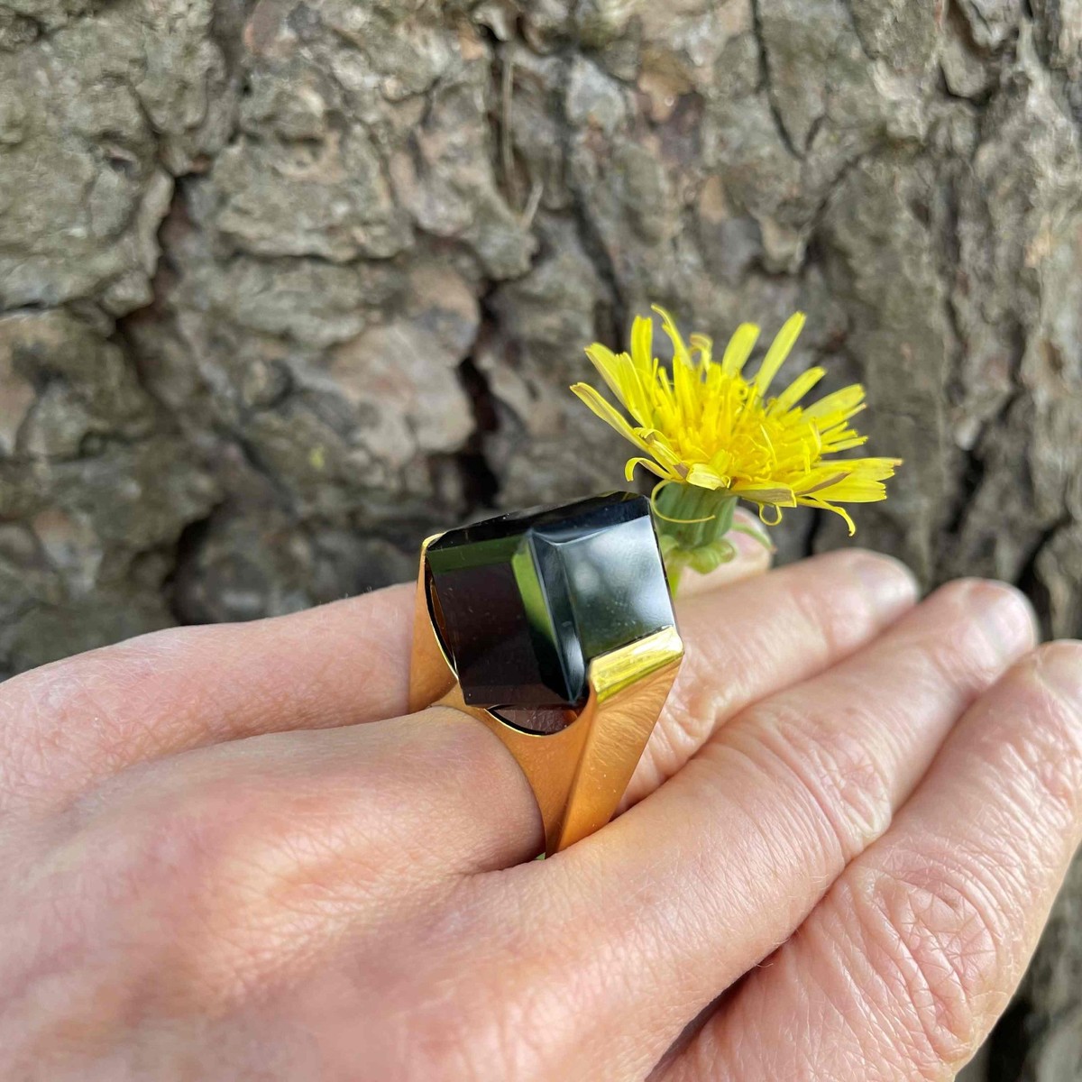 Here we have a seriously cool natural smoky quartz cube ring circa 1970 crafted in gold plated sterling silver.