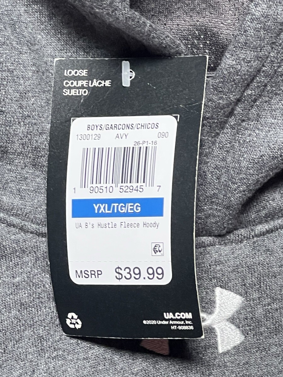 The product is an Under Armour Loose Hustle Fleece Hoody in dark gray, designed for boys in size XL. This pullover hoodie is made from fleece fabric, providing warmth and comfort for active boys. The simple gray color and boy character make it a versatile and stylish addition to any young boy's wardrobe.