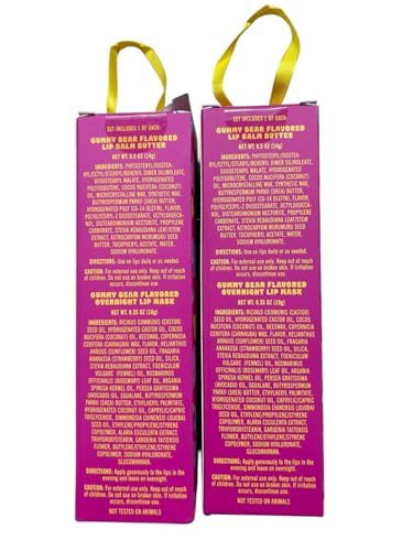 Product description: This fun, sweet and fruity Gummy Bear Flavored 2-piece set comes with one tube of Lip Balm Butter and a tub of Overnight Lip Mask. Perfect for every day use! Together in a cute, stocking-stuffer-sized gift box, they're packaged with a convenient ornament loop to hang on your tree. Containing some of mother nature?s finest moisturizers? coconut and avocado oil, and Shea butter. Help heal your lips while you sleep -- Apply a generous amount of the Overnight Lip Mask before going to bed.