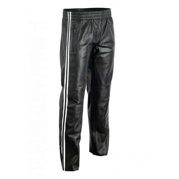 These pants are designed for the modern man who values both fashion and functionality. Featuring a sleek black leather finish with sporty white side stripes, they offer a trendy yet sophisticated look. The elastic waistband ensures a comfortable and adjustable fit, while zippered pockets provide secure storage for your essentials. Perfect for casual wear or a night out, these pants combine a sleek design with durable construction, making them a versatile addition to any wardrobe.