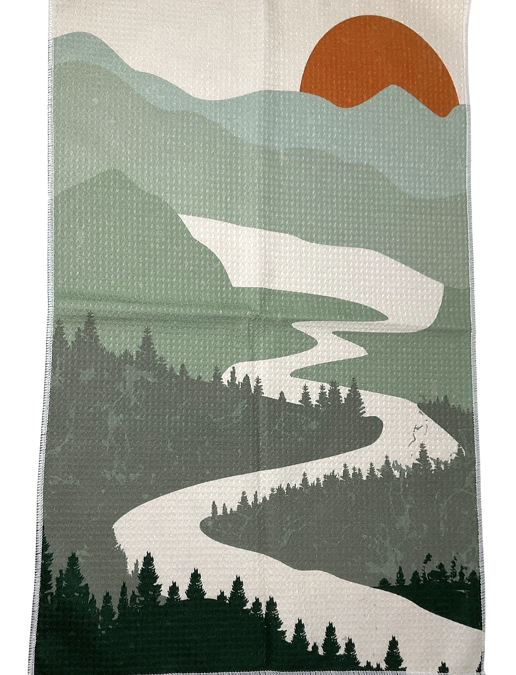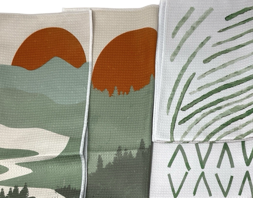Boho Green Mountain Dish Towel Set of 4 – Abstract Sunrise Sunset Kitchen Decor