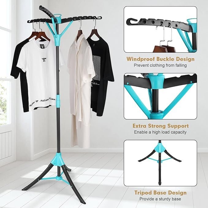 Large Capacity: With 3 hanging arms and multiple hanging holes design, the tripod clothes drying rack can hold up to 36 garments, max load is 33lb at a time, make air-drying easier. And windproof buckle design of hanging arms, prevent clothing from falling.