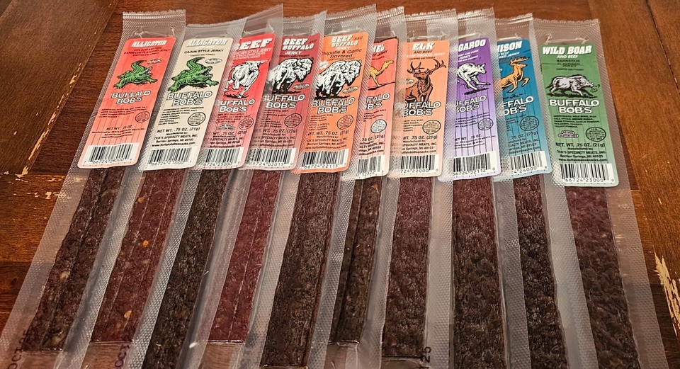 Alligator BBQ, Alligator Cajun, Beef Pemmican, Beef Buffalo, Buffalo Chipotle Garlic, Camel, Elk Hickory Smoked, Kangaroo, Venison Peppered, Wild Boar BBQ