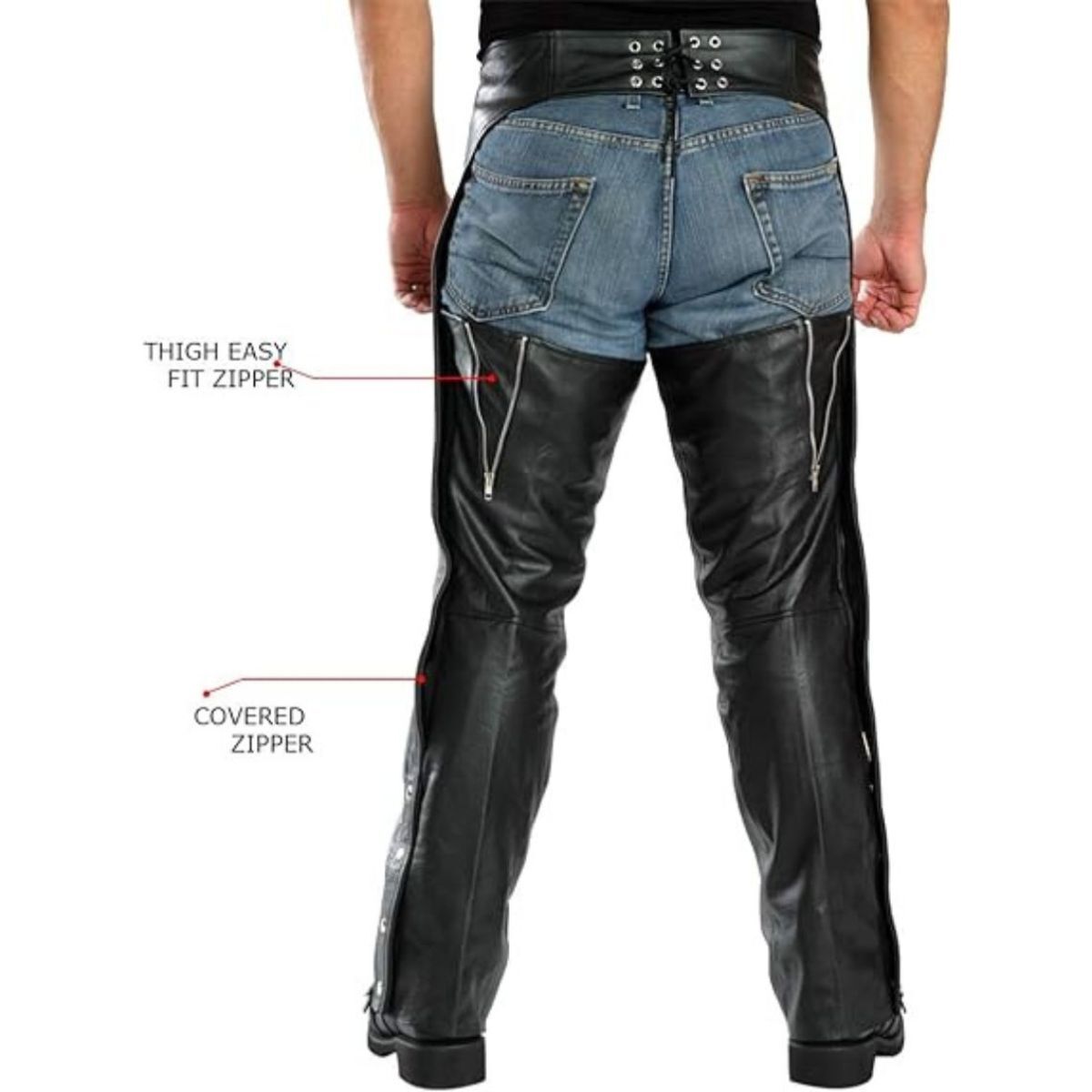 Introducing the Inferno Black Leather Biker Riding Chaps, crafted for the bold rider who seeks both style and protection. Made from premium leather, these chaps provide durability and a sleek, modern look. They feature an adjustable waist for a perfect fit and easy access to thigh zippers for added convenience. The reinforced stitching ensures longevity, while the covered zippers add a sleek touch. Ideal for motorcycle enthusiasts, festivals, and seasonal wear, these chaps are designed to impress and endure.