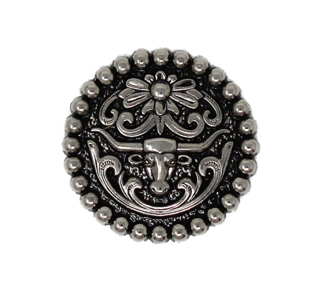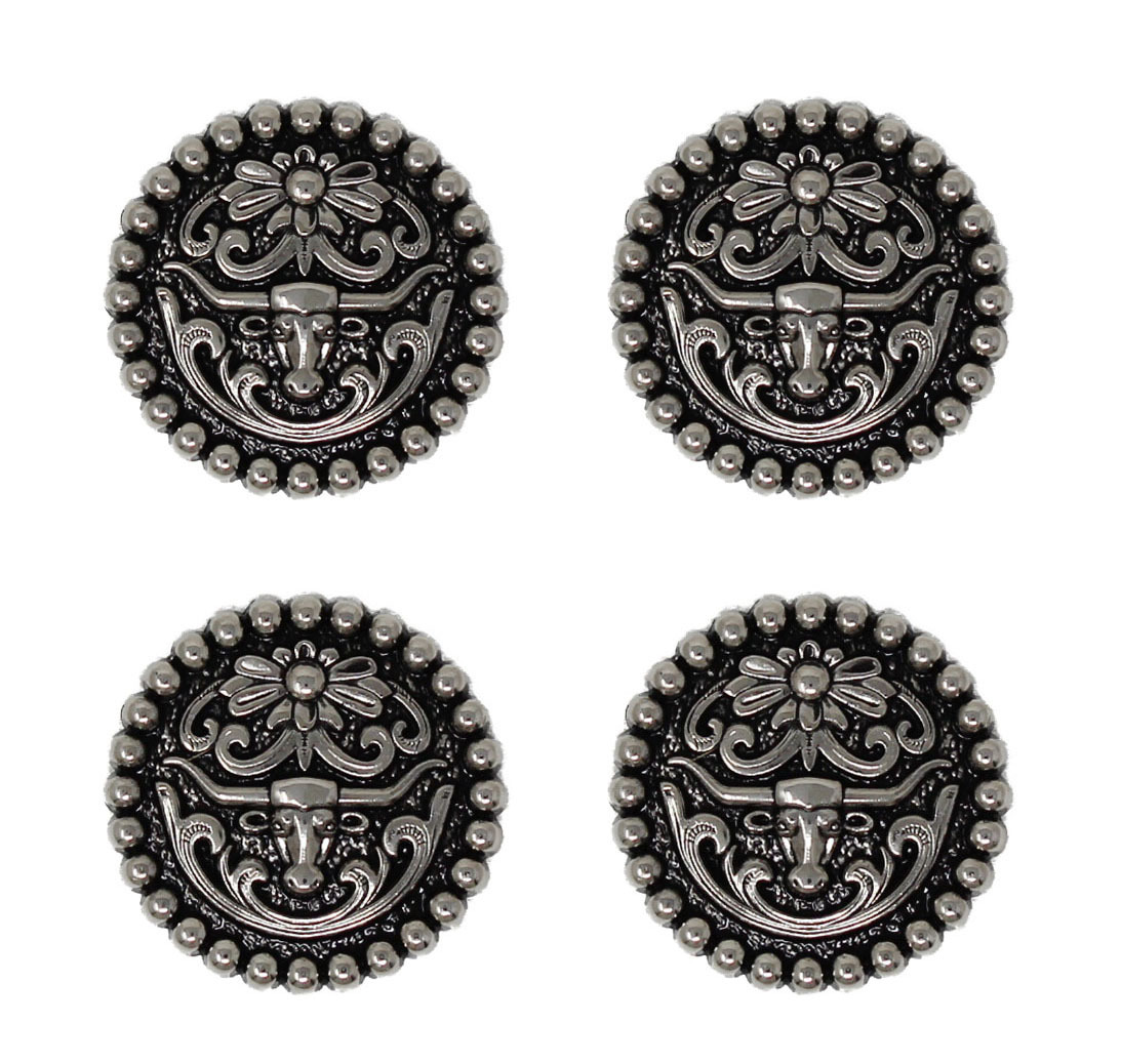 Set of 4 screw back silver conchos. Conchos are accented with a longhorn and floral engraving . They measures 1 1/4" (32 mm) in diameter. Easy to install with chicago screws included. Beautifully accents any tack, saddle, belt, or bag.
