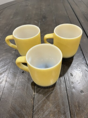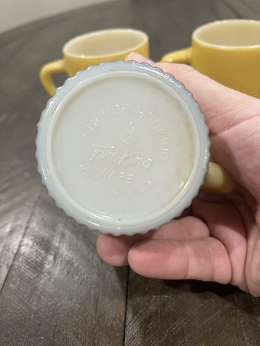 Add a pop of color to your coffee routine with this vintage Anchor Hocking Fire King coffee mug. The lemon yellow to brown milk glass material is ribbed for durability and stackable for convenience. Measuring 2.75 inches in diameter and 3.5 inches in height, this mid-century modern style mug is perfect for all occasions. The stackable feature allows for easy storage and the vintage original design is sure to impress. This mug is made by the renowned brand Anchor Hocking and is a part of the Fire-King product line. Ideal for any coffee lover, this mug is a must-have for your collection.