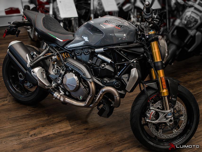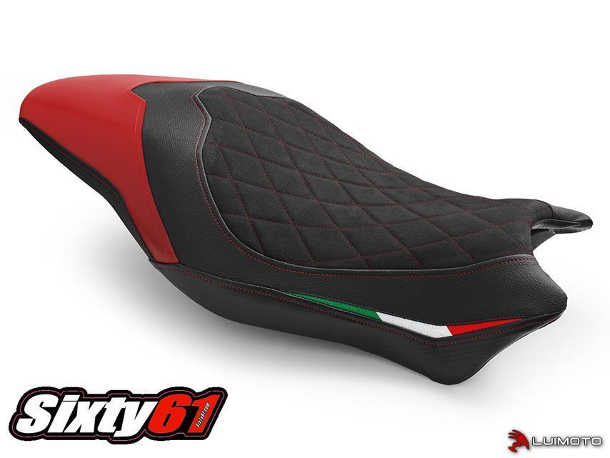 Maximize the style of your Ducati Monster 821 or 1200 with a Diamond Edition seat cover! Featuring a luxurious synthetic suede riding surface stitched in our famous Diamond quilt. Synthetic leather and carbon fiber textured vinyl is handcrafted beautifully to flow with your Ducati at every angle. Aggressive Italian flags, and contrast stitching complete the design. Stand out with the finishing touch of Luimoto!