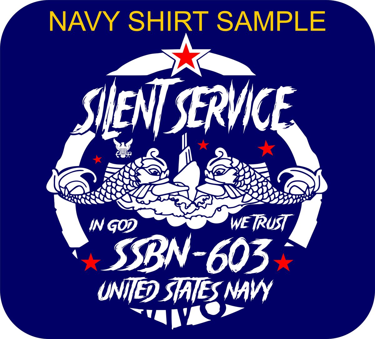 Gildan Cotton Blend T-Shirt with your hull # and submarine dolphins.