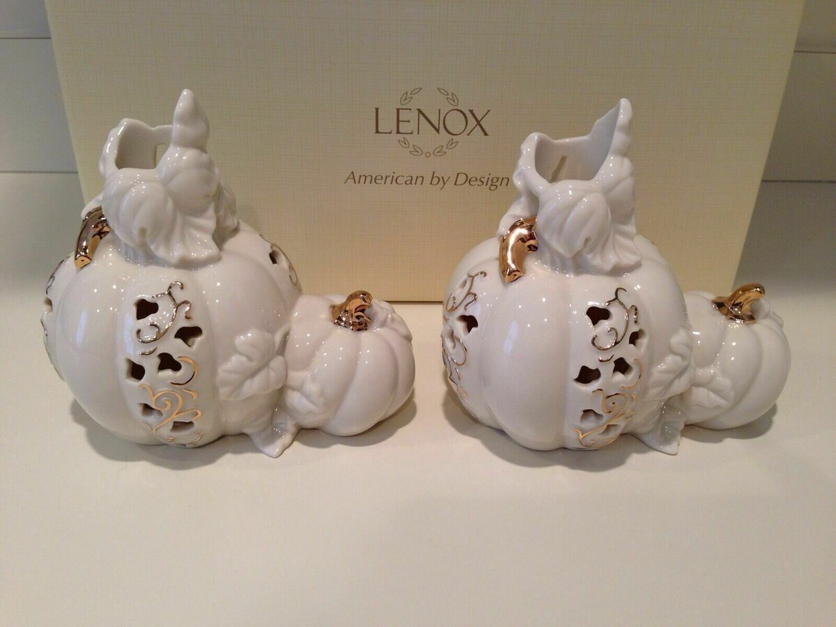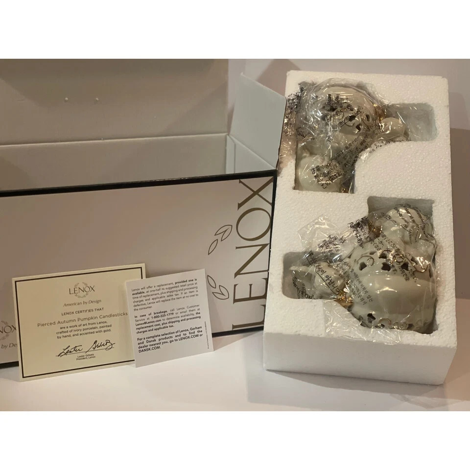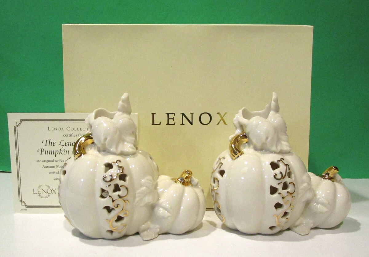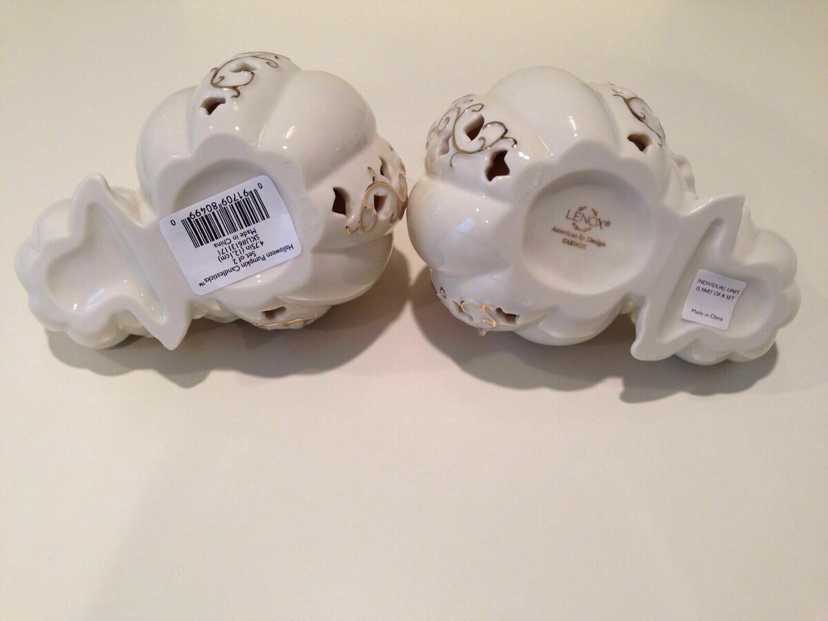 Lenox~ Halloween Pumpkin Candlesticks Candle Sticks Fall Autumn Mint NIB The artists of Lenox have taken the art of pumpkin carving to elegant heights. These sculpted candlesticks create an autumn landscape where ivory china pumpkins rise from the patch. Their graceful tendrils and stems are gilded in 24 karat gold. Delicate piercing through forms a rich pattern of deep shadow leaves against the creamy surface. Gracefully sculpted foliage frames standard tapers (not included). Cast a spell on Halloween party guests... and provide dramatic glow at Thanksgiving. Crafted of Lenox ivory fine china accented with 24 karat gold Bears the Lenox hallmark Height: 5" Width: 6" Depth: 3 1/2"