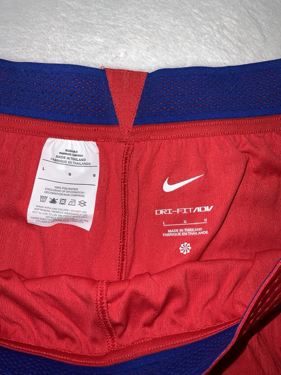 The Men's Nike Dri Fit ADV Team USA Shorts are a patriotic and athletic piece of activewear designed for men. These red shorts feature the iconic Nike brand logo and are ideal for various active occasions. The shorts come in size L and are perfect for showing support for Team USA while staying comfortable and stylish during workouts or sports activities.
