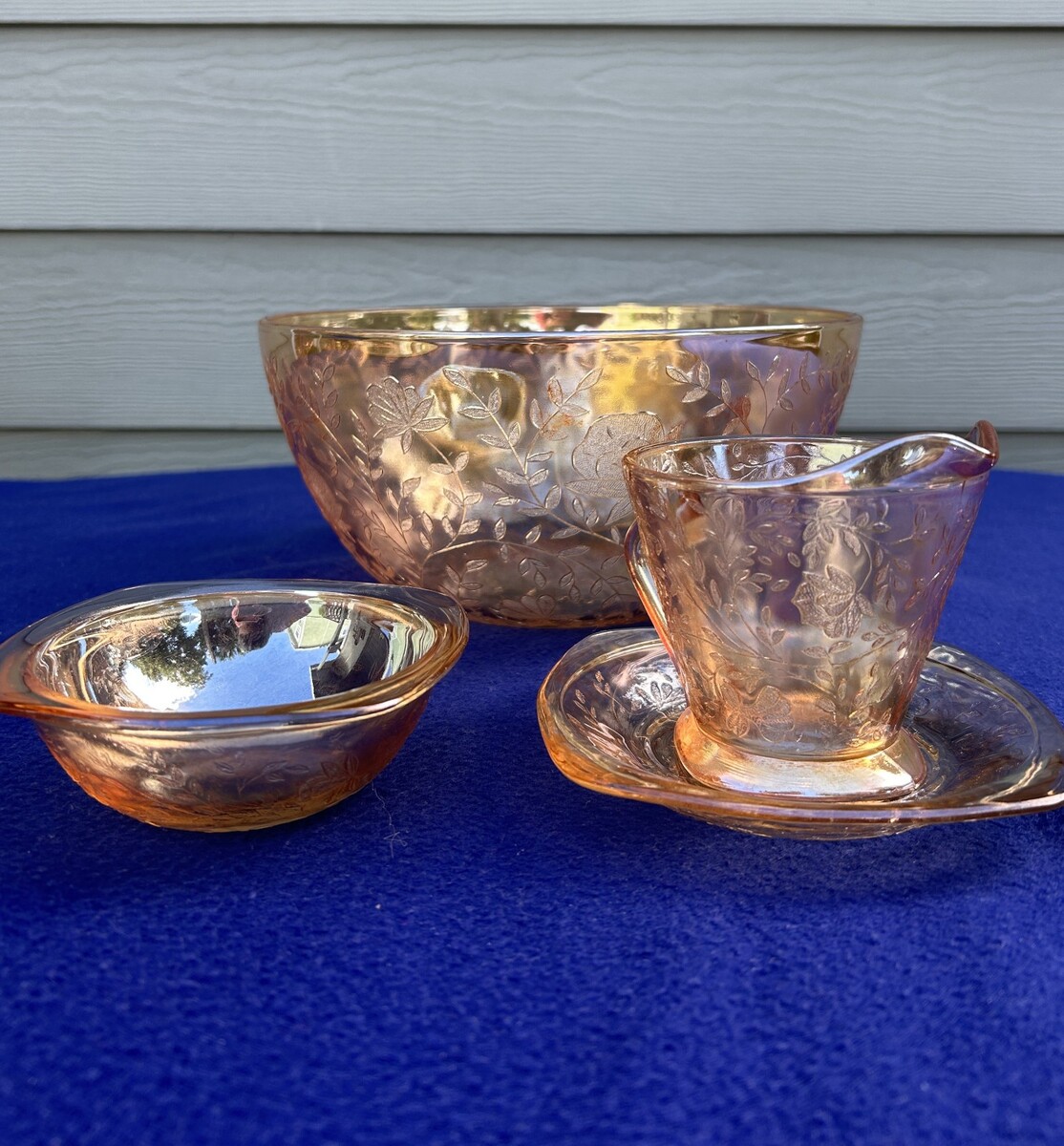 Jeannette glass Floragold marigold carnival pieces that really warm up a room. Includes very large salad bowl,9"x4 5/8", sandwich plate 13", small pitcher (creamer) 3"x 5", holds 8 oz, bread or underplate 5 1/4" and small 4" square bowl. No chips or cracks, see pictures for usage scratches, uneven color.