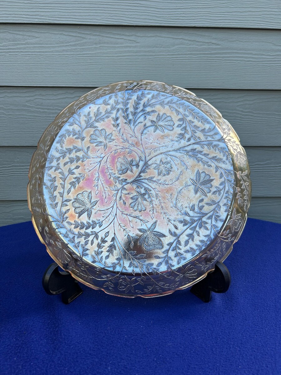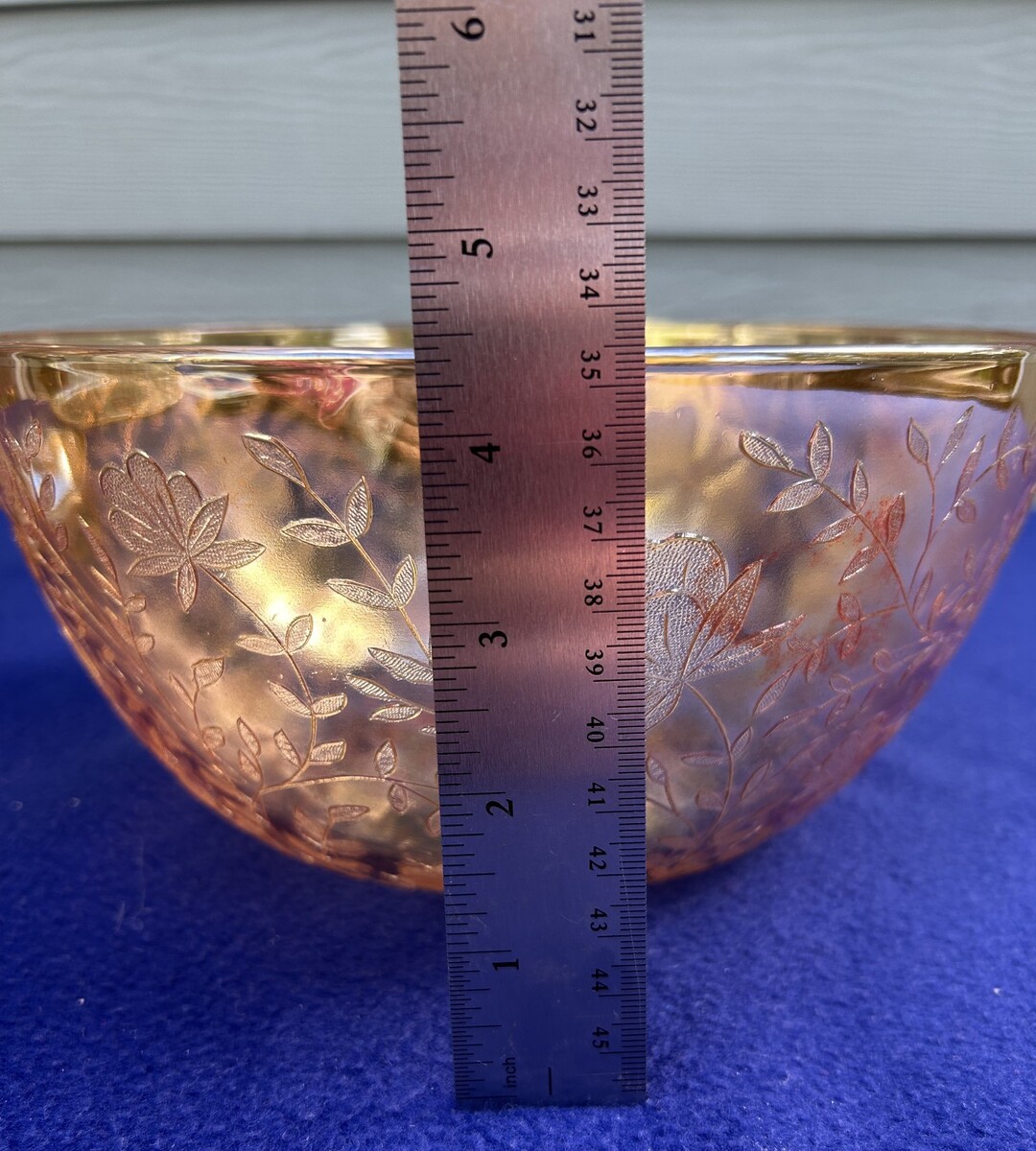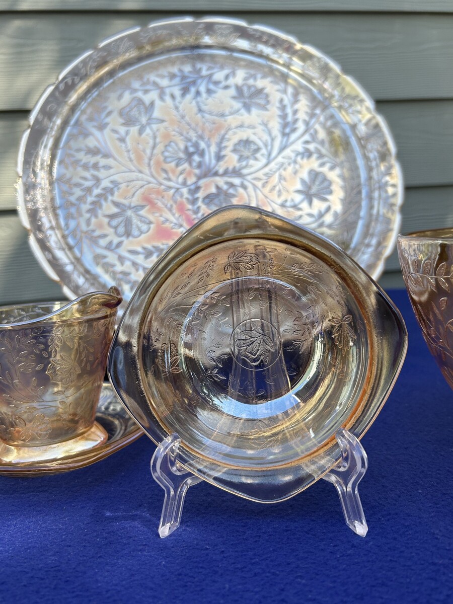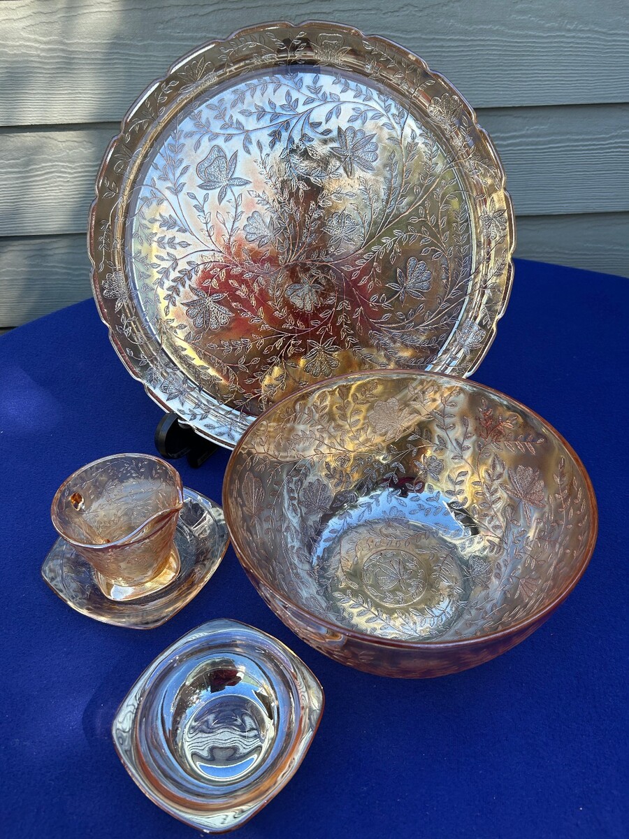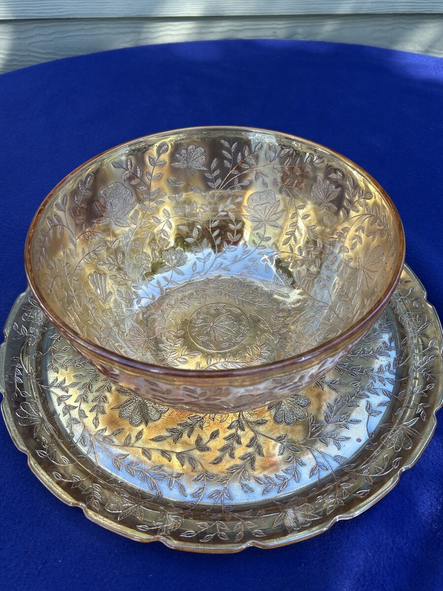 Jeannette glass Floragold Louisa carnivalized 9" bowl, 13" plate, accessories