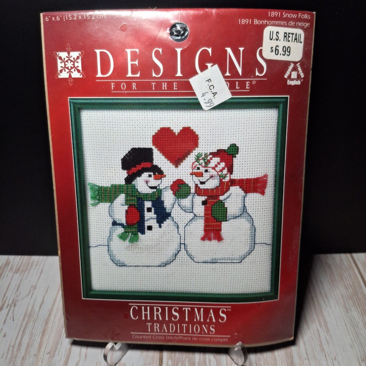Leisure Arts Designs For The Needle SNOW FOLKS #1891 counted Cross Stitch Kit Christmas Traditions. Finished size 6"6". Appears to have discoloration on Aida near package opening, see photos.