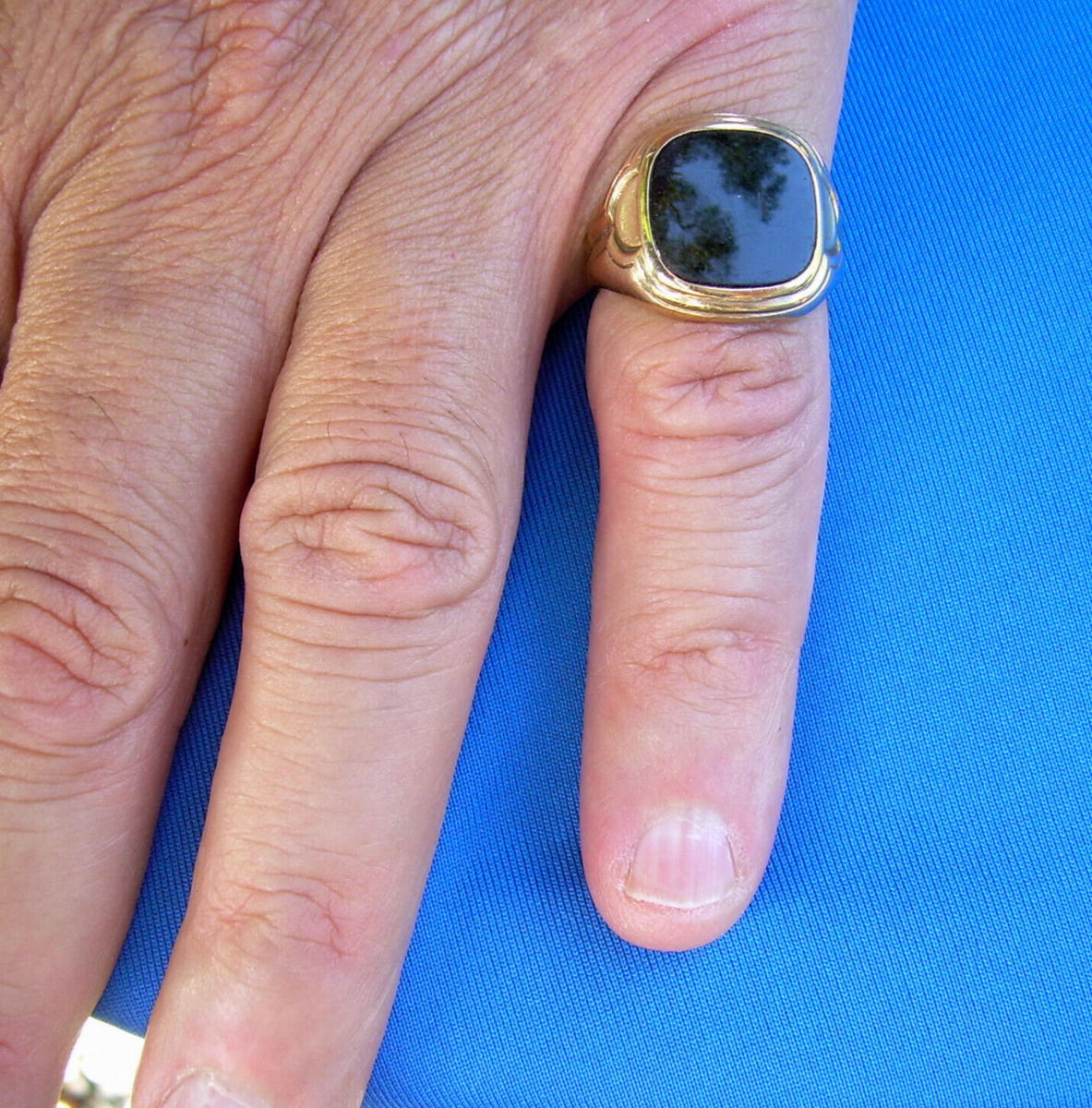 Signet ring with onyx is 14 millimeters wide bezel top.