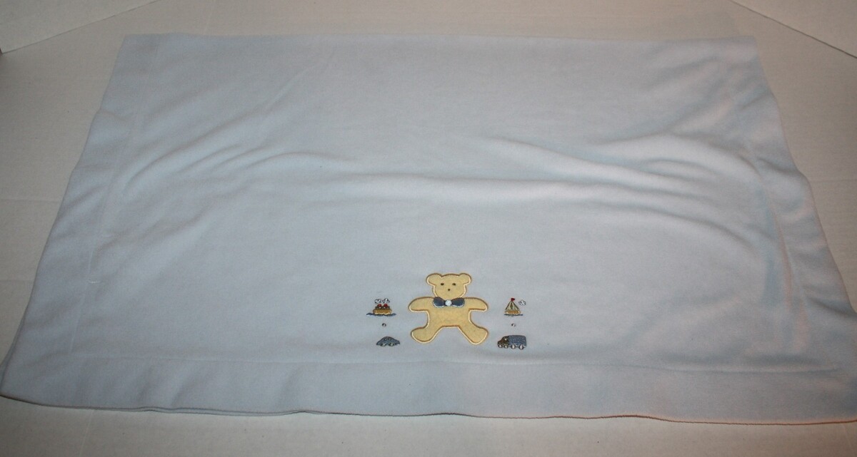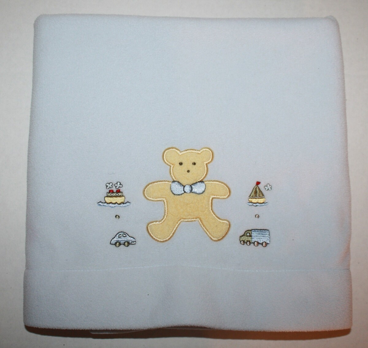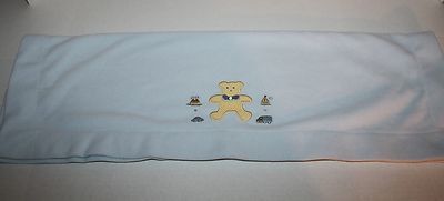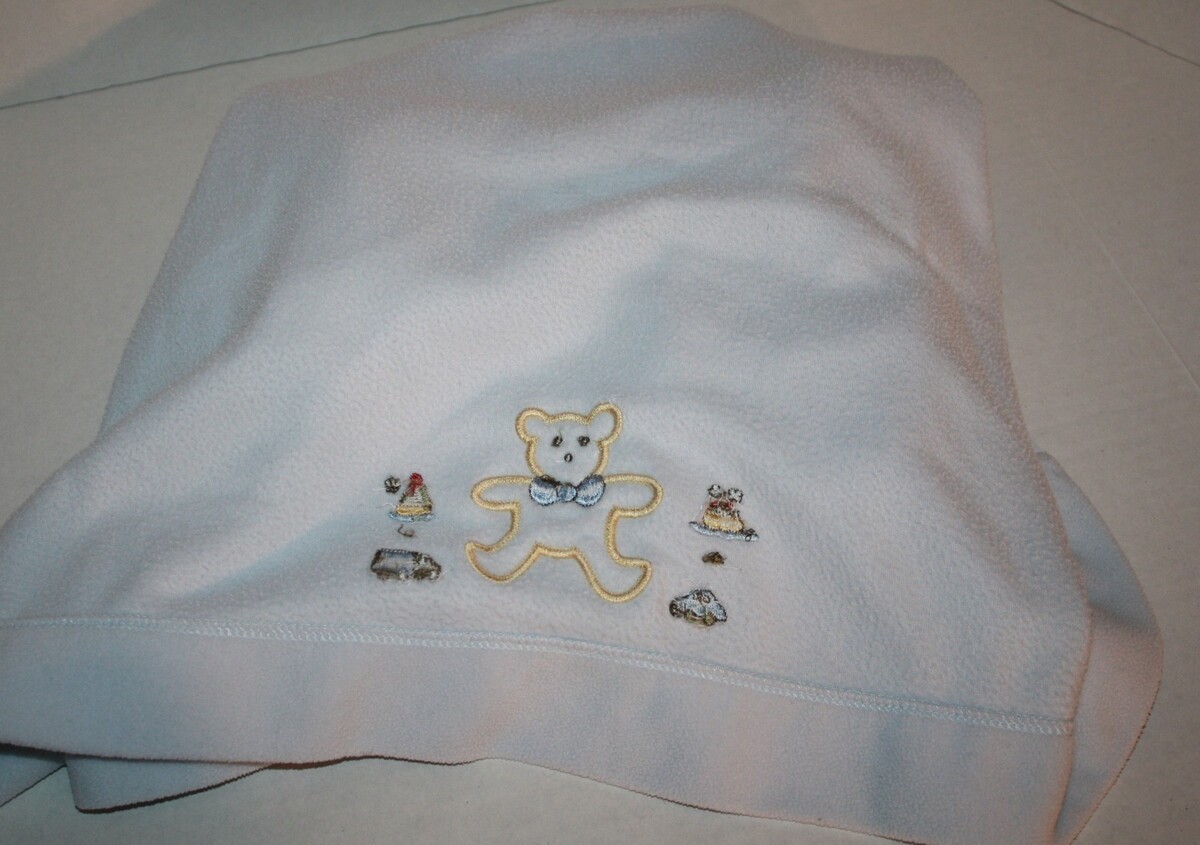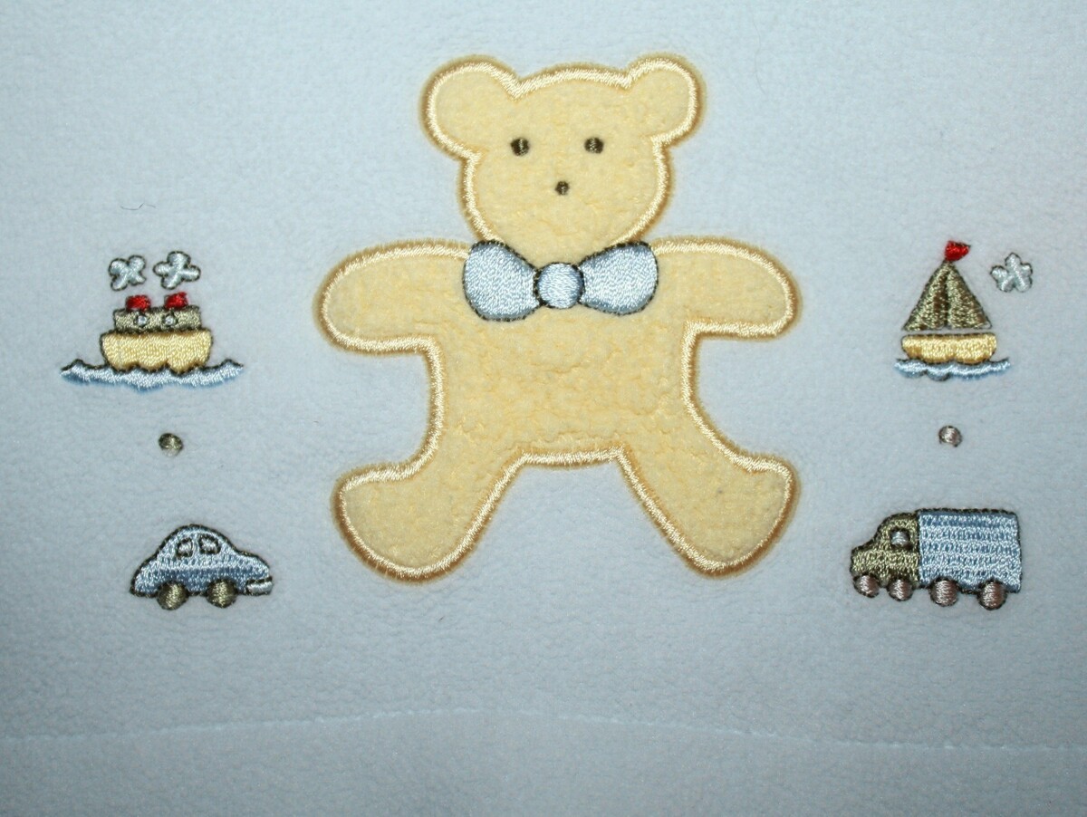 Features: Soft blue fleece baby blanket with teddy bear, car, boat, sail boat and truck