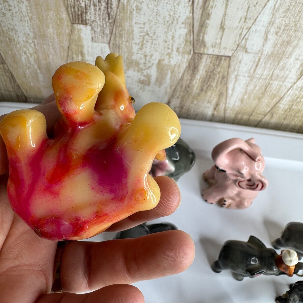 NO CHIPS OR CRACKS HOWEVER SOME HAVE DISCOLORATION MARKS. TWO IDENTICAL FIGURINES HAVE CHAINS ATTACHED AND USE TO BE ATTACHED TO ANOTHER FIGURINE WHICH IS NOT AVAILABLE. ONE FIGURINE IS A CANDLE AND THE BLACK ELEPHANT I BELIEVE IS METAL.