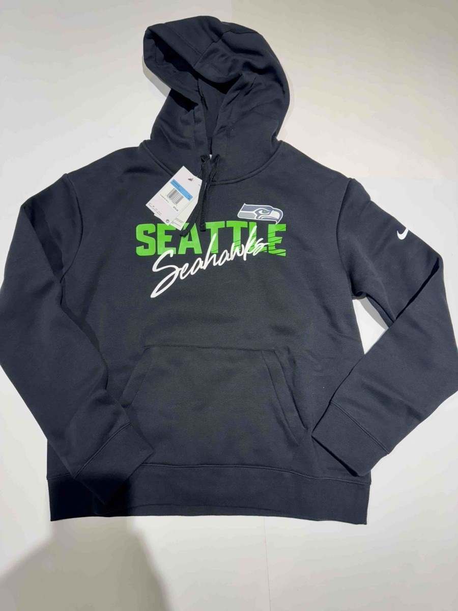 The product is a Women's Nike Heather Gray SEATTLE Fleece Pullover Hoodie in size small. It is an officially licensed sweatshirt featuring the Seattle Seahawks team logo and colors. The hoodie is perfect for football fans, specifically those who support the Seattle Seahawks, to wear during the regular season games. Made by Nike, a trusted brand in sports apparel, this hoodie combines style and comfort for female fans looking to show their team spirit.