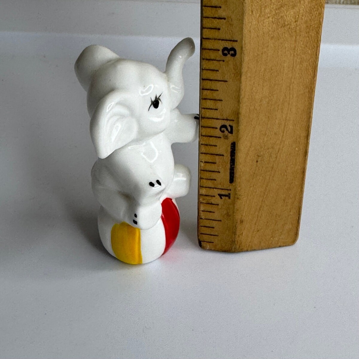 Keywords: ceramic, figurine, elephant, circus, toy, collectible, desk decor, shelf sitter, whimsical, novelty, animal art, vintage decor, miniature