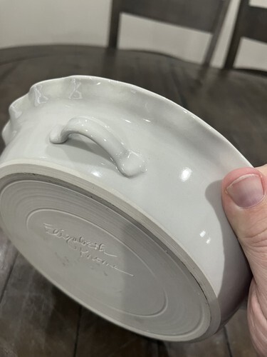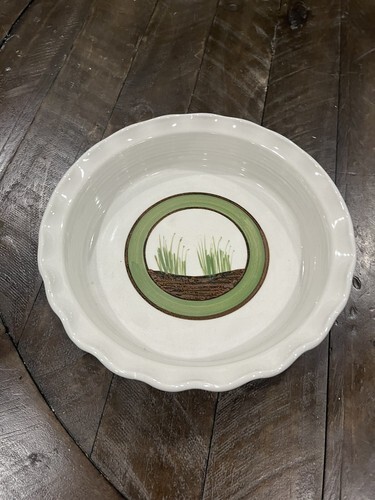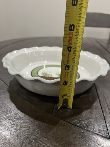 Add a touch of vintage charm to your kitchen with this beautiful Elizabeth Krome Quail Run hand-painted pie dish. This round dish is made of high-quality stoneware and features a unique art pottery production style. The beige color gives it a timeless look that will complement any decor.