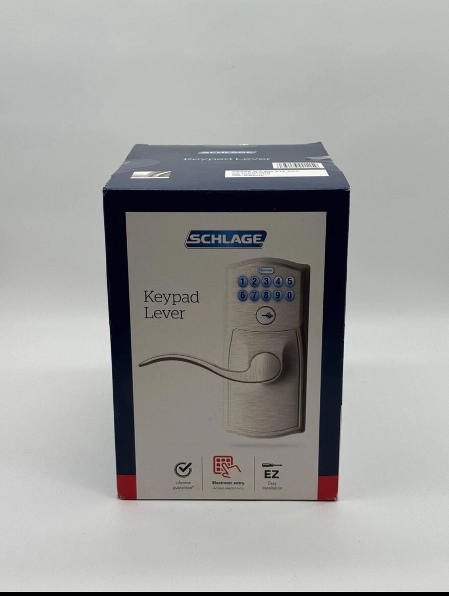 The SCHLAGE FE595 V CAM 619 ACC Camelot Keypad Entry in Satin Nickel is a new keyless entry system featuring an accent lever design. This model, compatible with other Schlage products, offers a sleek satin finish and is made from nickel material. Ideal for home improvement projects involving doors and door hardware, this smart door lock provides added security and convenience with its keyless entry feature. Perfect for those looking to upgrade their home's entry system with a trusted brand like Schlage.