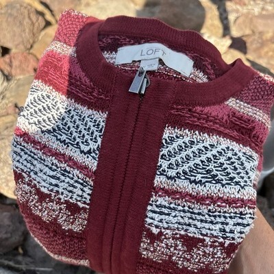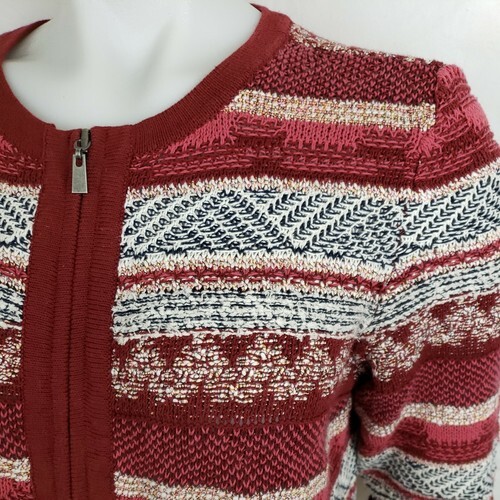 Loft Textured Sweater Womens Medium Brick Red Stripe Zip Cardigan Cotton Blend