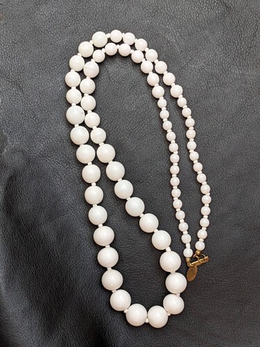 A vendre est un collier de perles de verre blanc Miriam Haskell vintage d'occasion avec fermoir coulissant noue qui mesure 28 pouces de longueur totale.