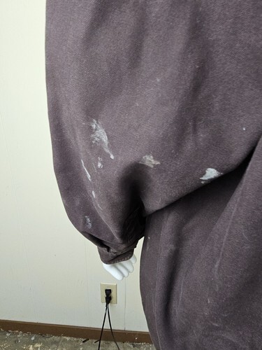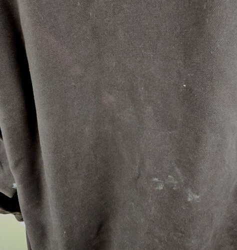 Distressed. Several paint stains and 2 tiny holes to the outer shell. Lining is excellent without pilling or fade. Very clean and ready to wear.