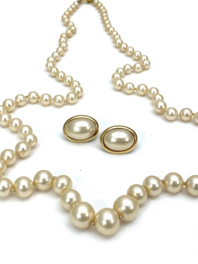 Necklace of graduated faux pearls is 30" long, Earrings are 1", and clipback..It is a beauty and in mint condition.