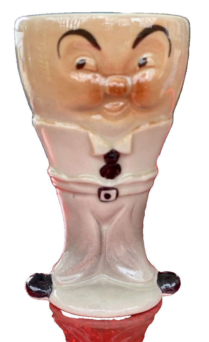vintage egg cup is part of a set with Humpty Dumpty and 6( I think) egg cups. This one is 3 1/2" tall and in excellent condition-No Chips or cracks, do not see any crazing. The rim dent is an imperfection not a chip.. ( Note- this is for ONE egg cup)